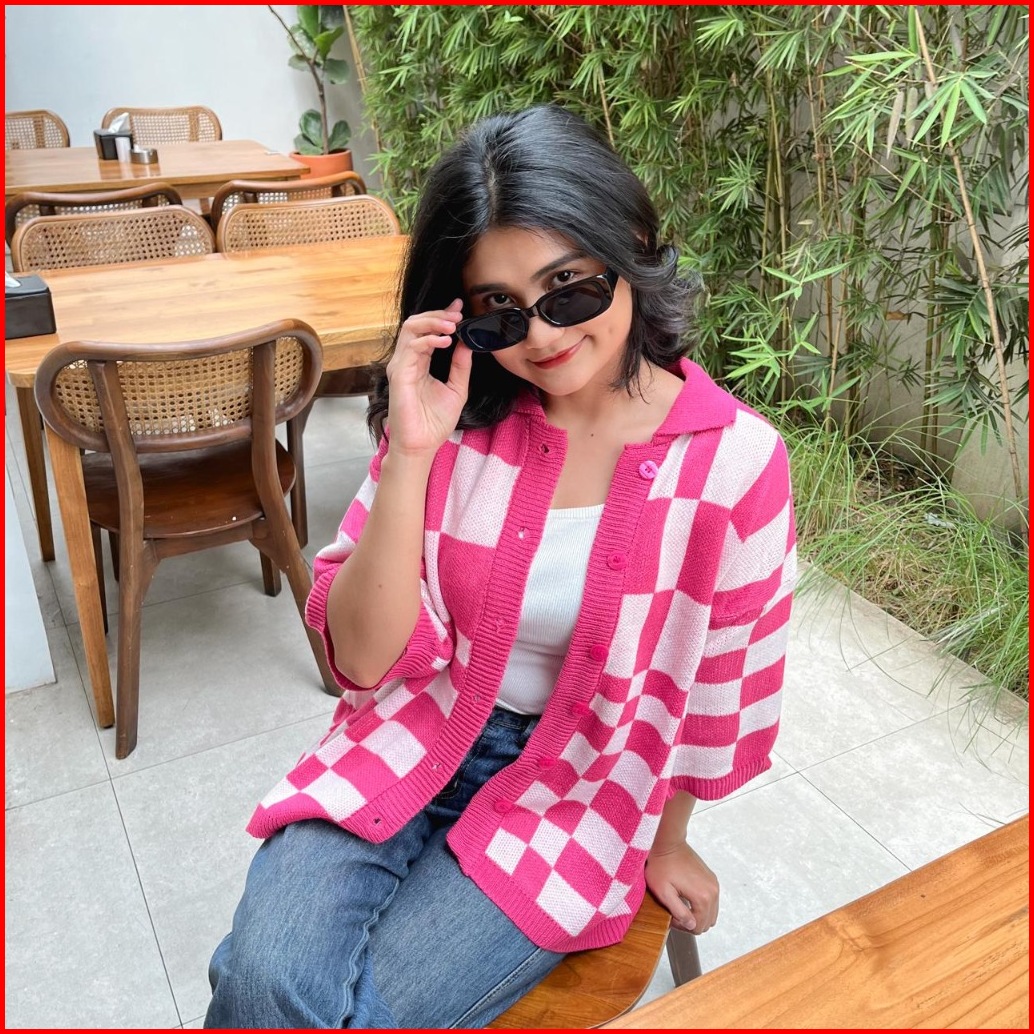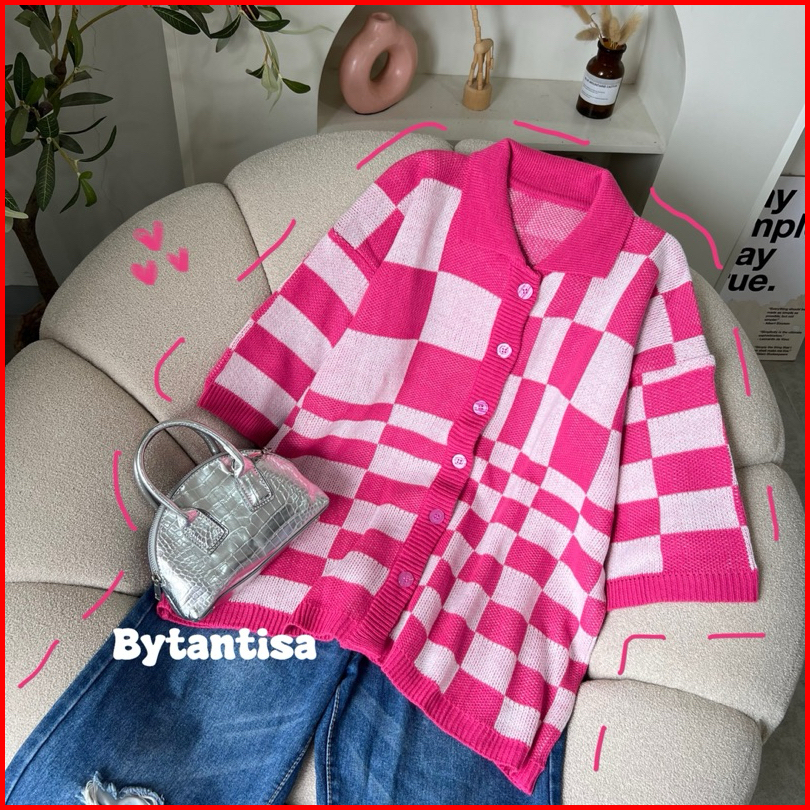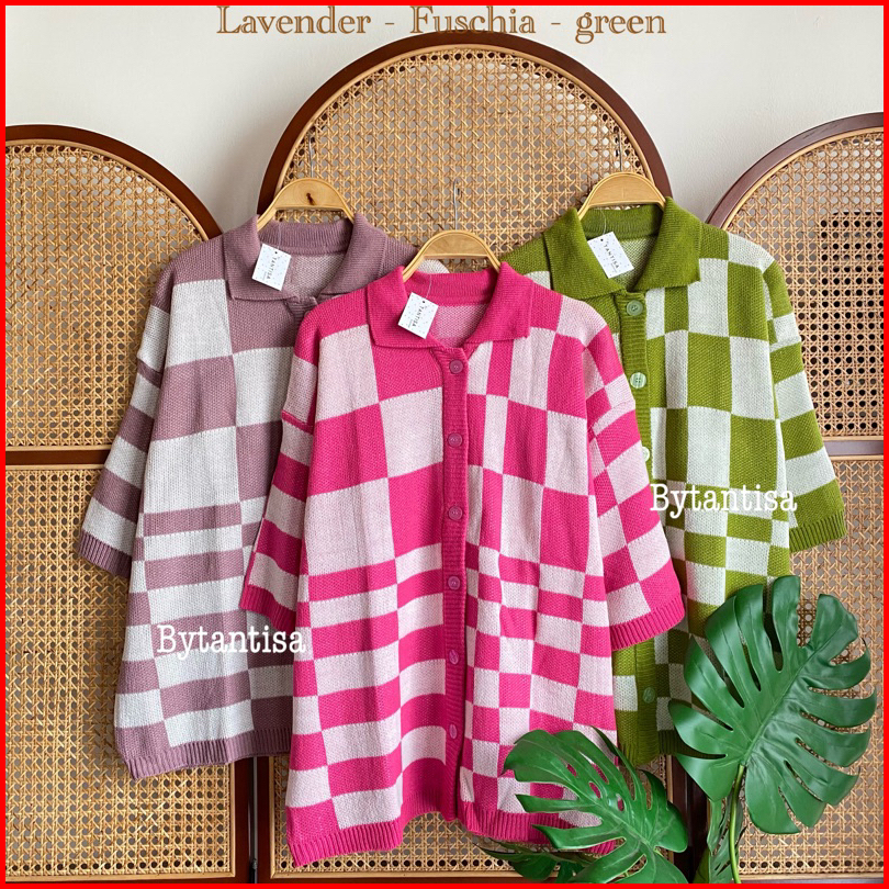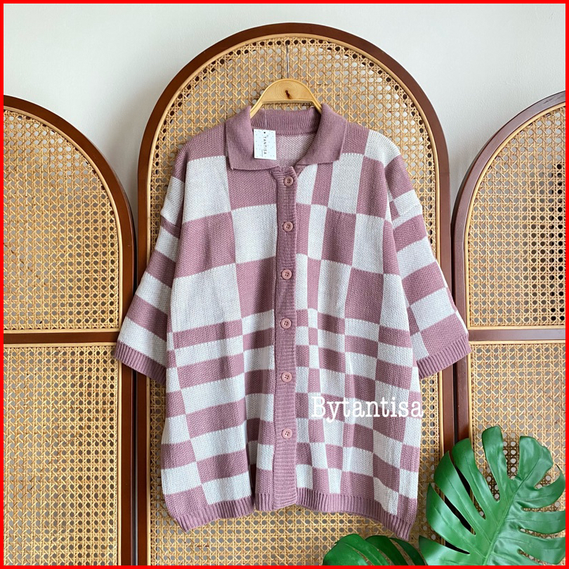 Bytantisa - Cardigan Polo Rajut 3 4 Oversize Hasna Motif Kotak
