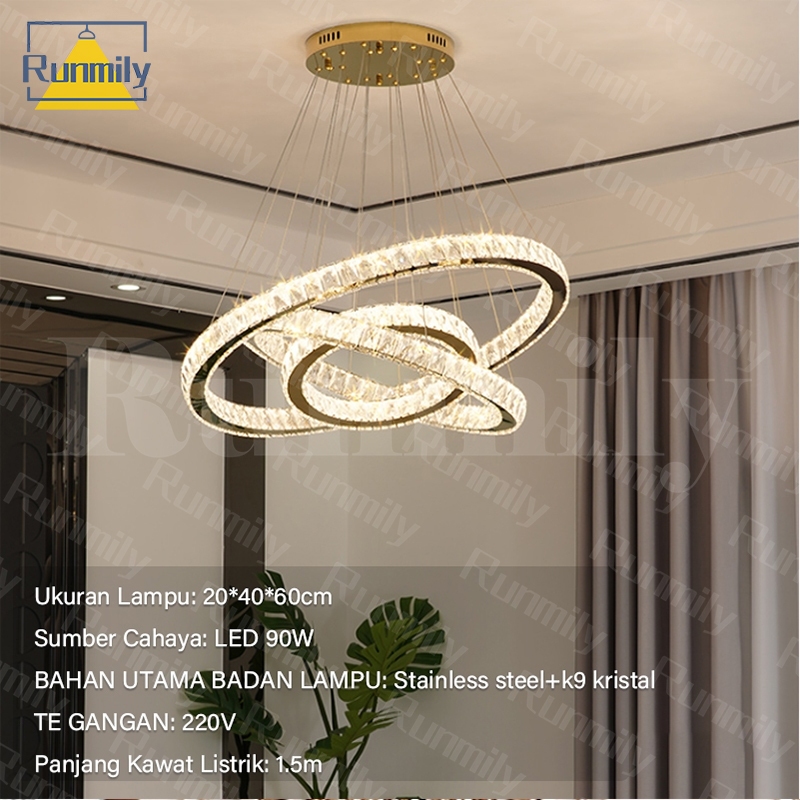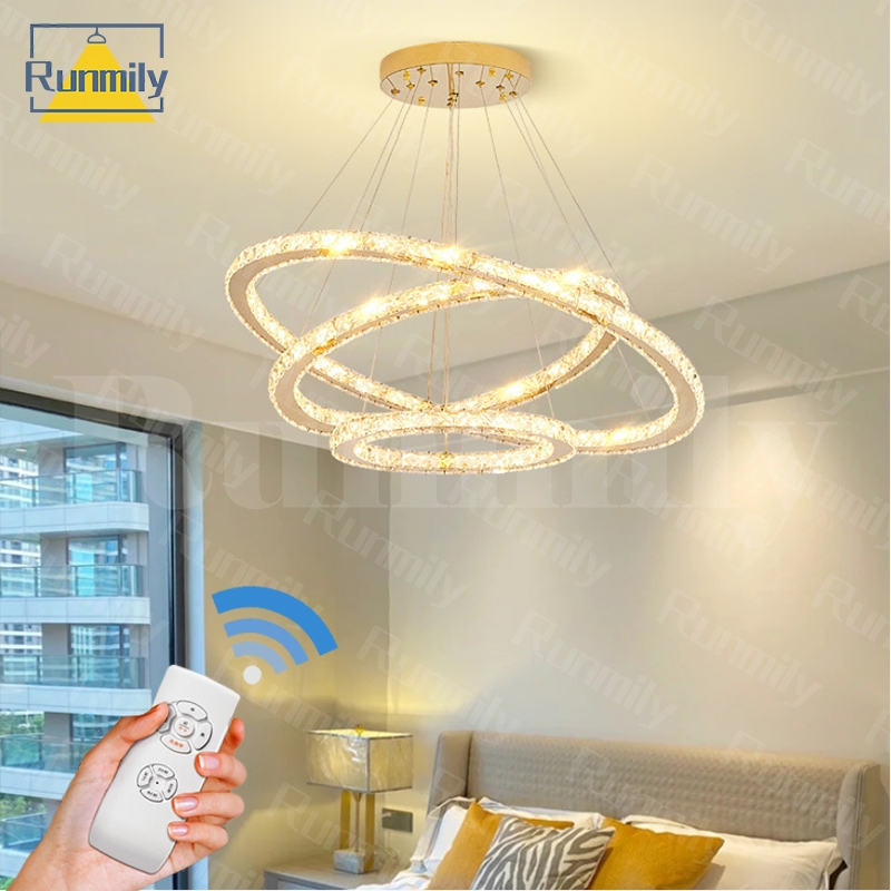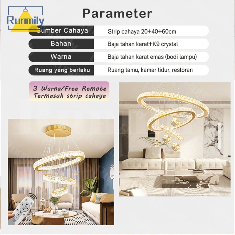 Free Remote &100% Kristal Lampu Kristal Gantung 60+40+20CM 3 Warna LED Mewah Stainless 60 Watt/ Chandelier Lampu Gantung