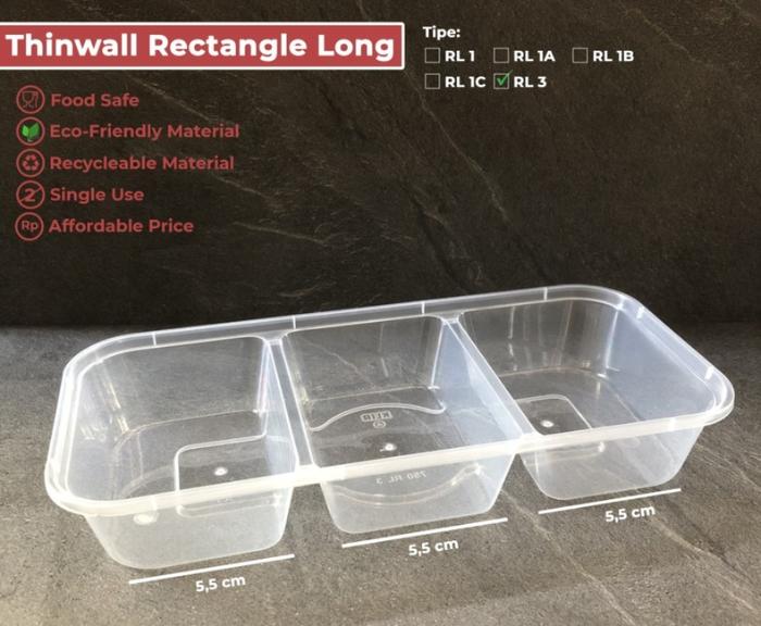 Isi 25Pcs Thinwall Kotak Panjang 750Ml Rl 3 / Thinwall Klir Rectangular Long 750Ml Sekat 3