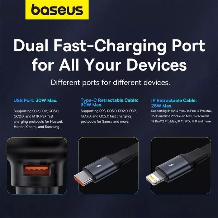 Baseus Car Charger Mobil 2in1 Cable Type-C & iphone Lighting Retractable Fast Charging