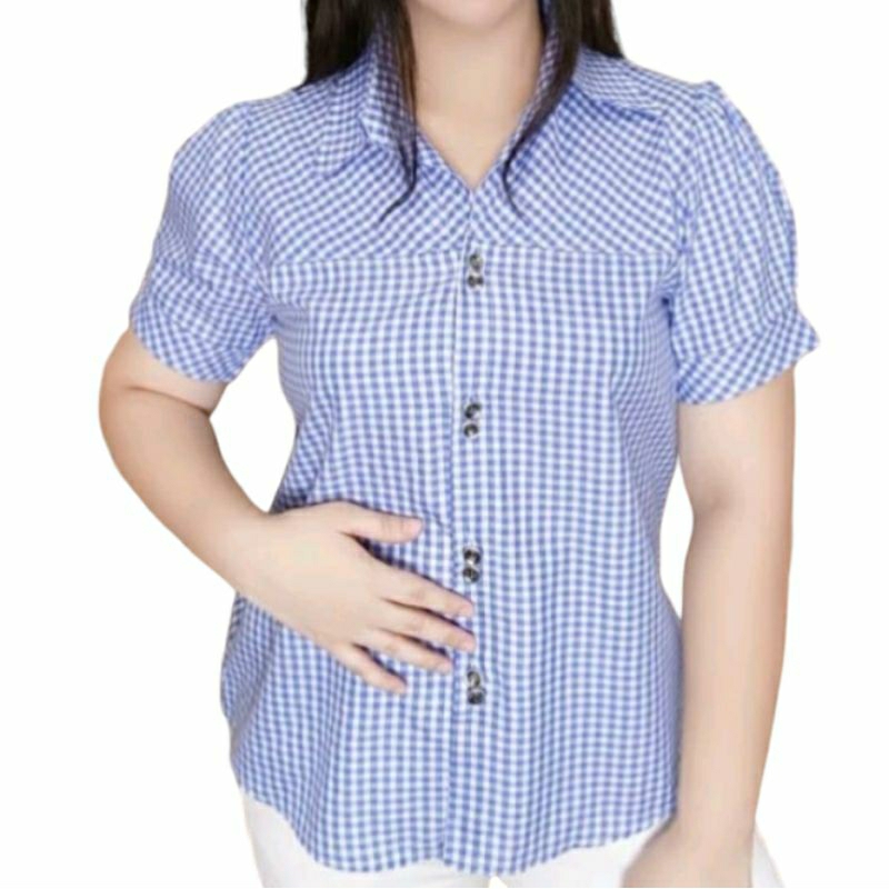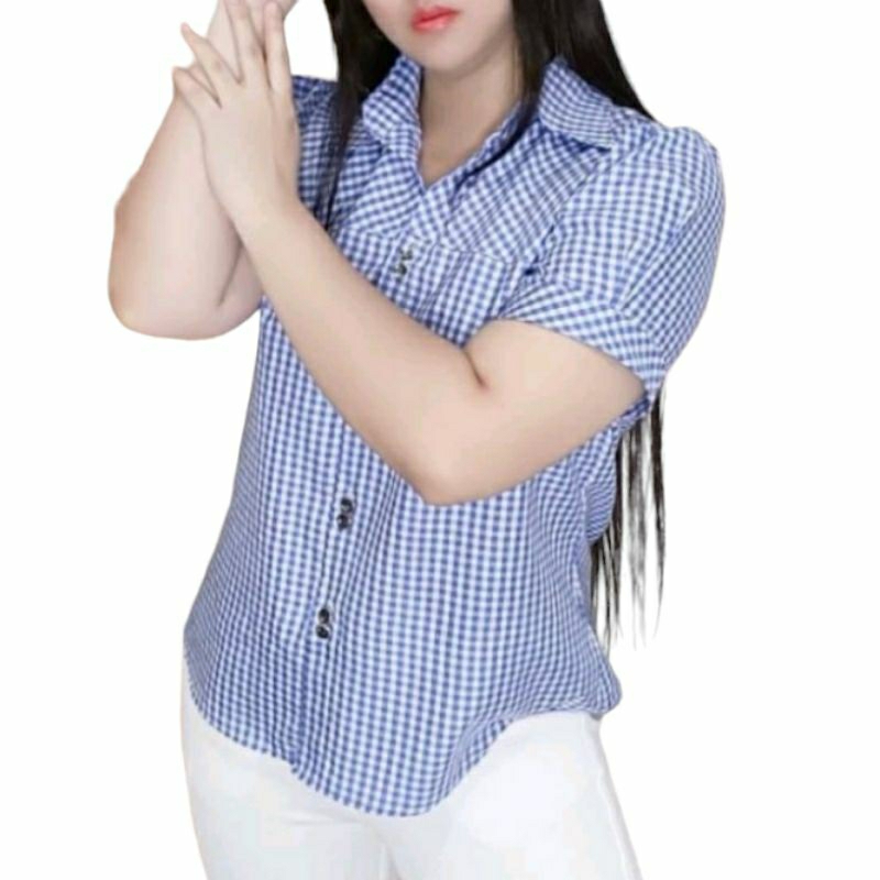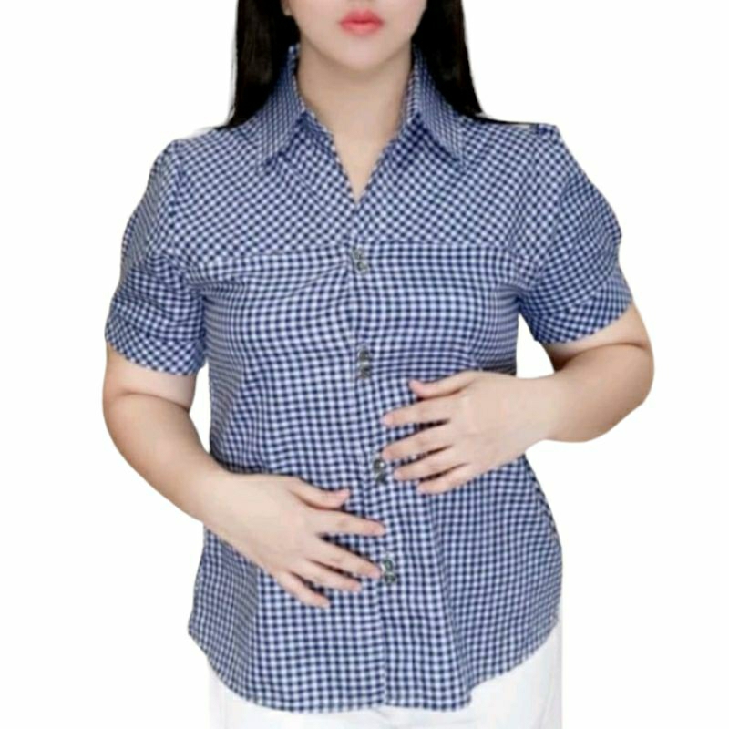 Kemeja Jumbo Motif Kotak Catur Kasual Wanita Bahan Katun Kotak Lengan Pendek Kerah Kemeja