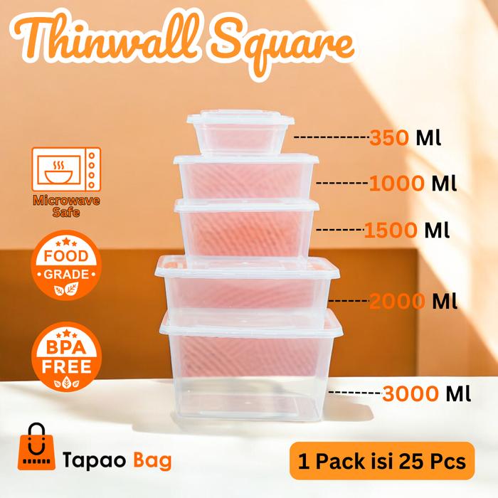 Isi 25Pcs Thinwall Square | Kotak Makan Plastik Kotak | Food Container 1000 Ml 1500 Ml 2000 Ml 3000 Ml - Pack - Square