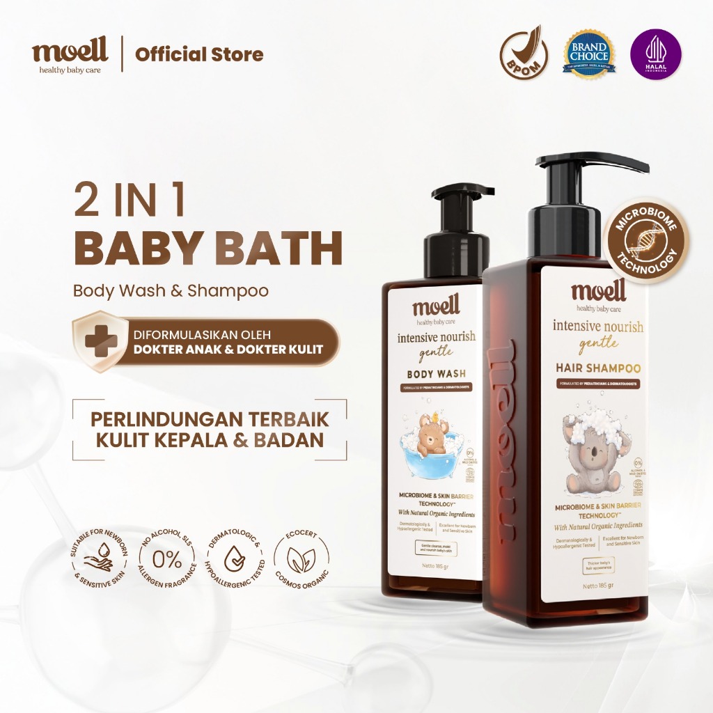 Moell Gentle Body Wash 185gr & Shampoo 185gr - 2 IN 1 Baby Bath Sabun & Sampo Bayi Anak Cegah Eksim - Aman untuk Kulit S