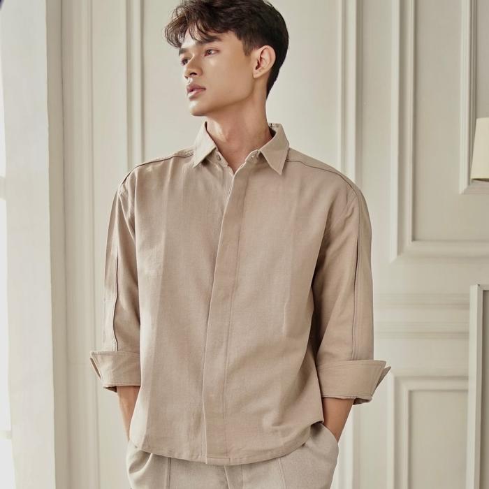 HANEUM - Kemeja Linen Pandawa - Kemeja Linen Hidden Button Kemeja Pria Lengan Panjang Pendek Jumbo