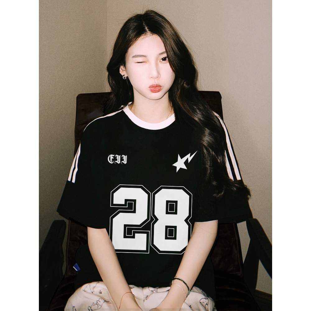 SEZO Baju Wanita Putih Black Kaos Premium Lengan Pendek Oversize Kaos Motif Angka 28 Atasan Wanita Kekinian Korean Style