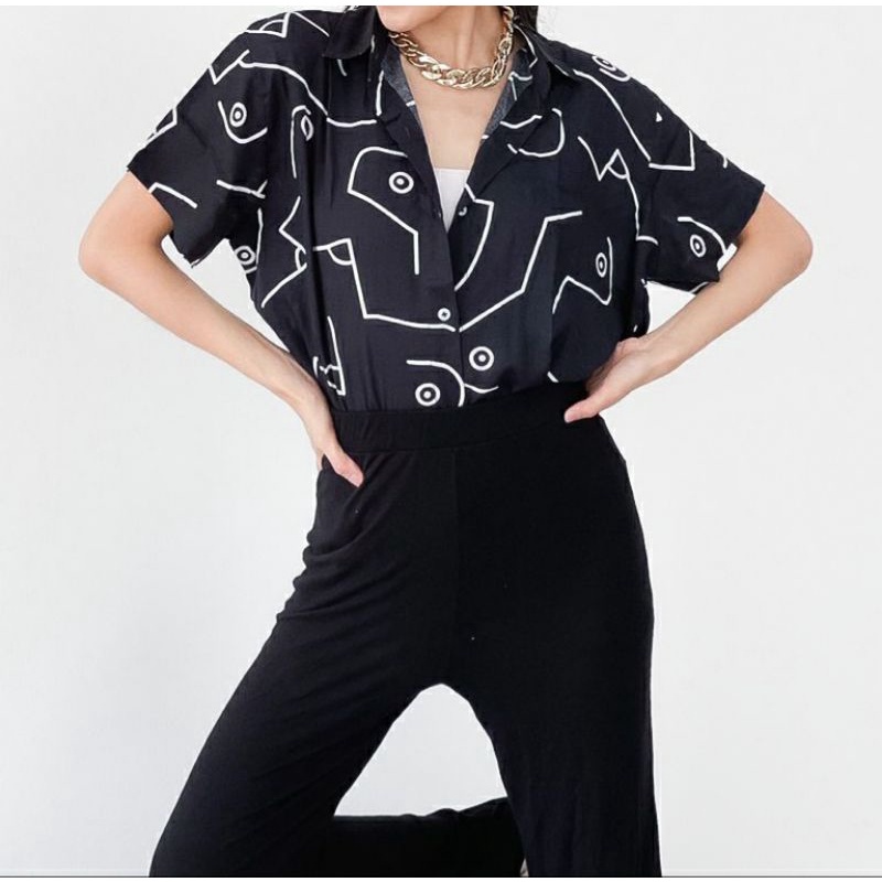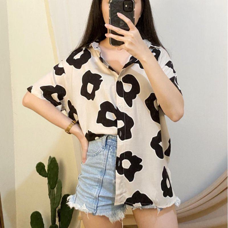 kemeja wanita oversize lengan pendek pattern shirt vintage motif printing bahan rayon viscose adem tanpa kusut