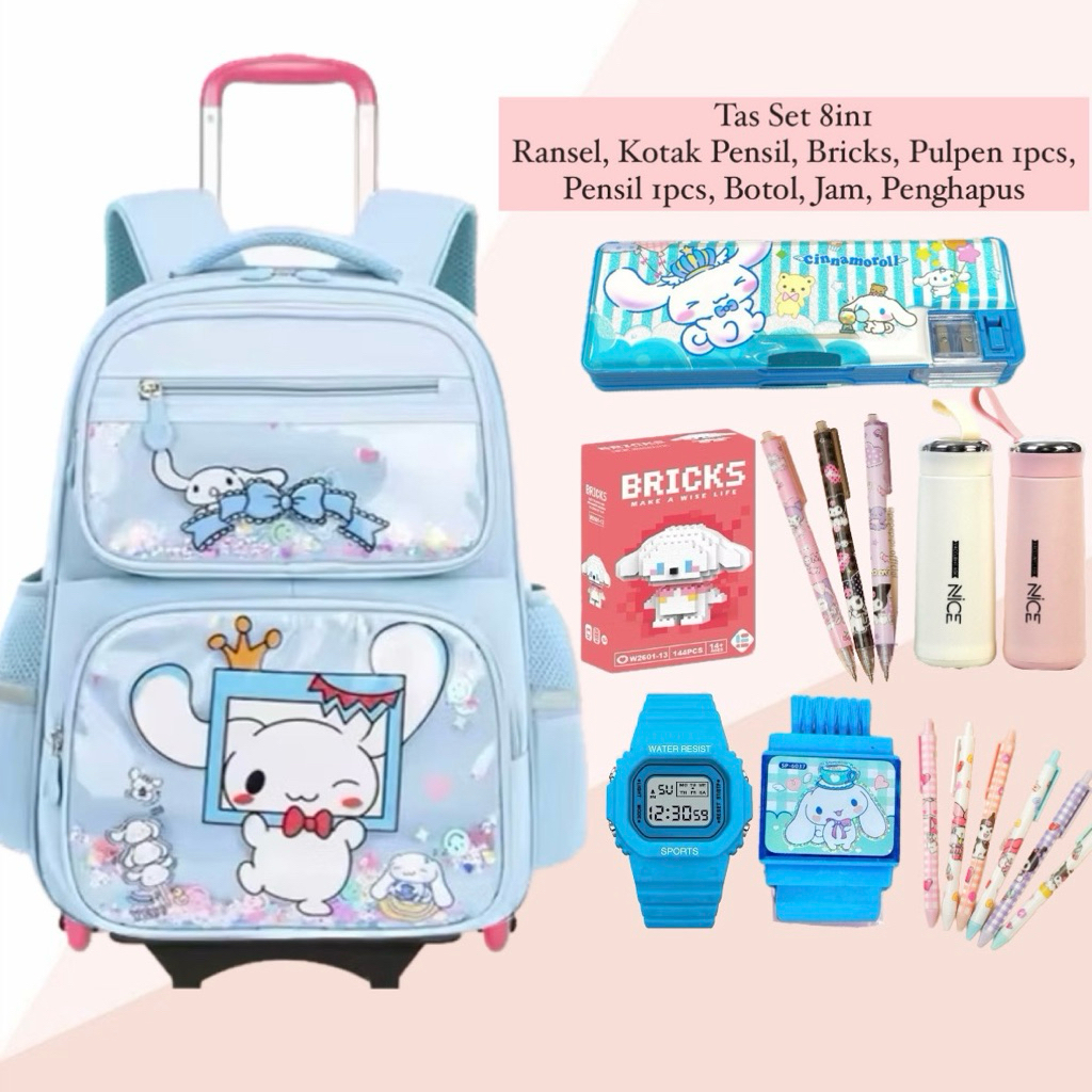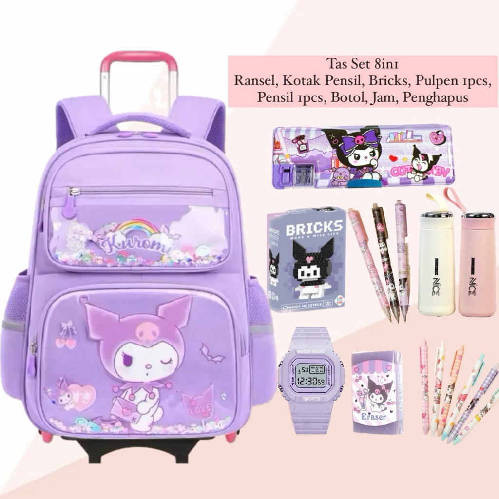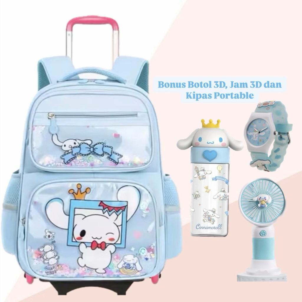 Tas Ransel Troli Model Koper Mika Sanrio Kuromi Melody Cinnamoroll 7in1 Paket Lengkap Jam Botol ATK Kipas Tas Dorong Sekolah Karaktek TK SD SMP Terlaris Wanita
