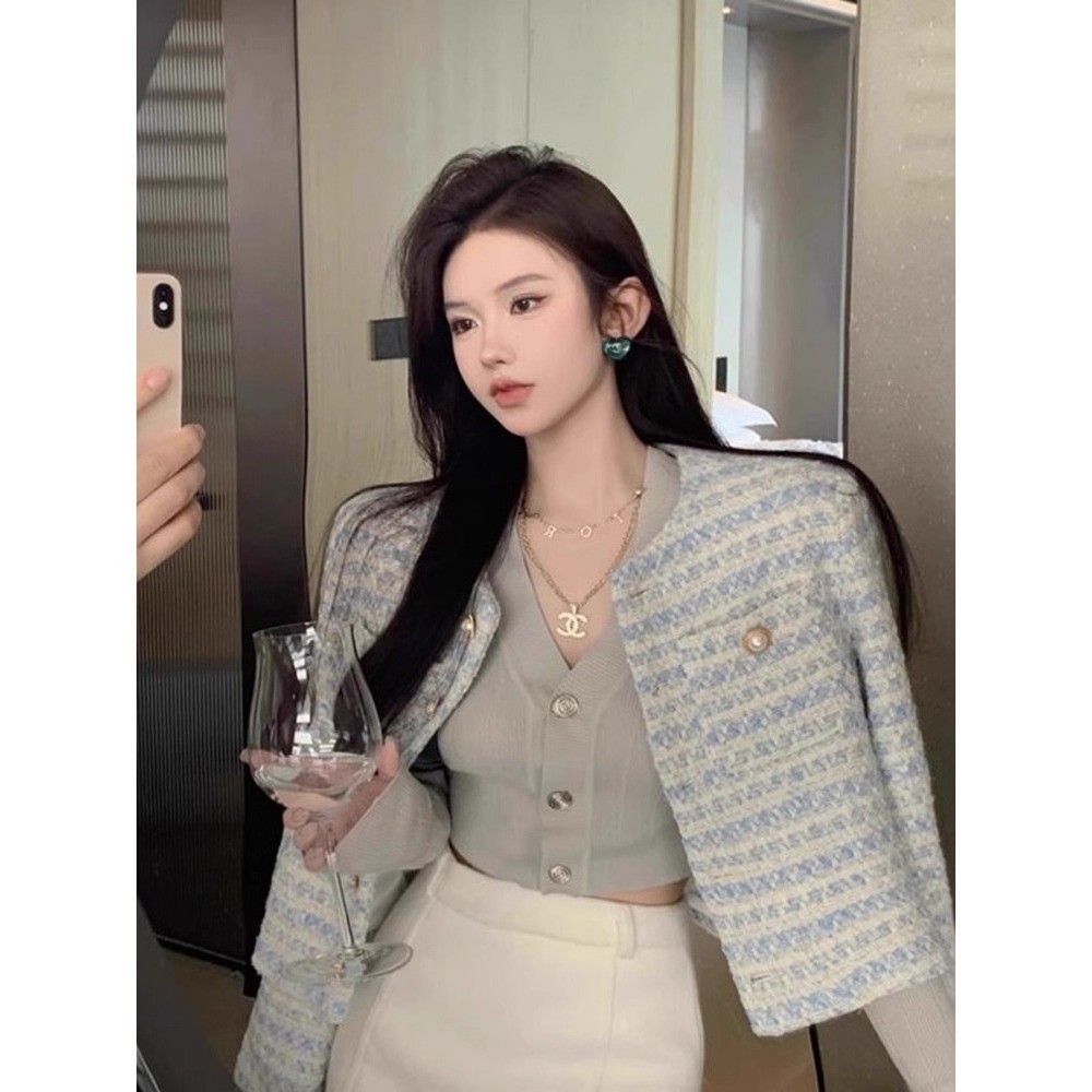 EMITA BLOOM baju outer biru polos wanita kekinian korean style kondangan simple elegan tweed blazer batik wanita premium elegant lebaran 2025