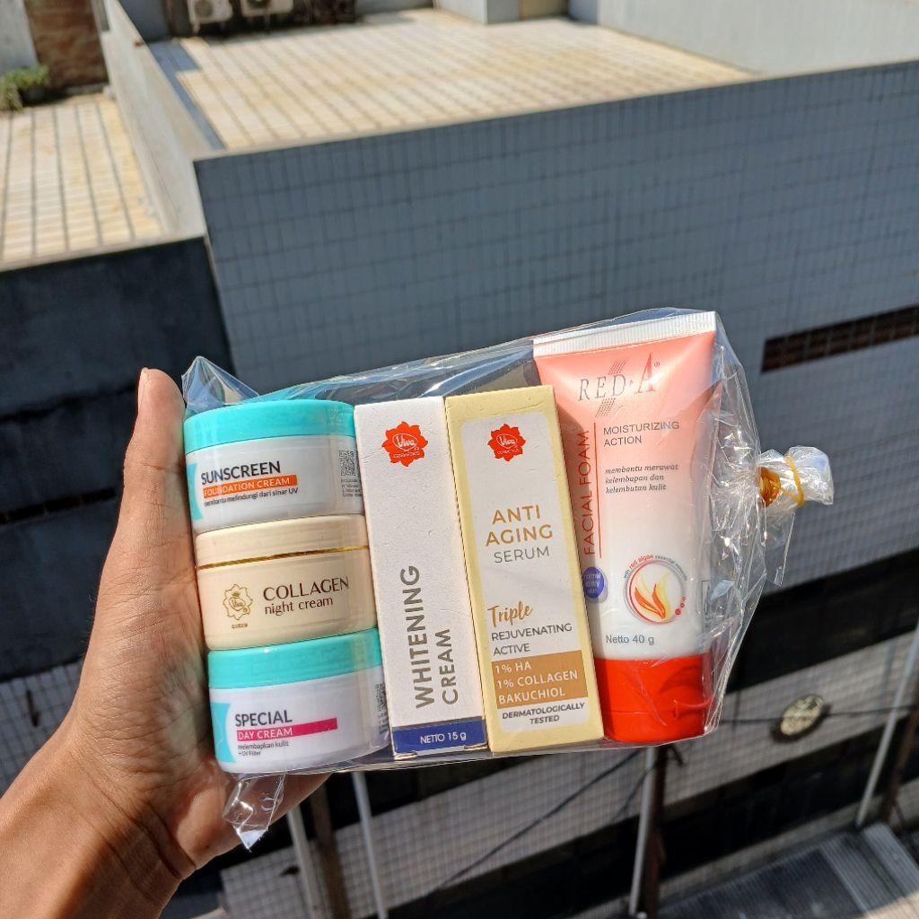 Paket Set Kecantikan Viva Cosmetik 6in1 BPOM Cream siang , malam. Sunscreen , Serum Viva , Whitening Cream , Facial Foam Red A