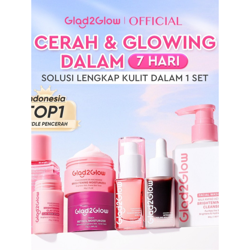 Cocok Untuk Pemula Glad2Glow Paket 7pcs Set Cerah Glowing Bundle all in 1 7in1-Brightening Moisturizer+Serum+Cleanser+toner+Peeling solution+Retinol 1