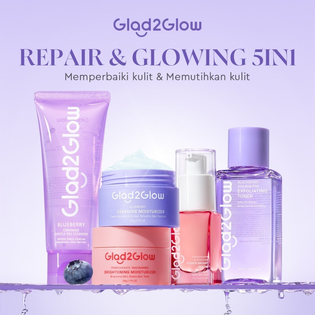 100 PERSENORI REPAIR&GLOWING SET Glad2Glow Glowing&Sehat&Lembap Bundle 5in1-Blueberry Moisturizer+Cerah Krim+Brightening Serum+Pulihkan cleanser+eksfoliasi
