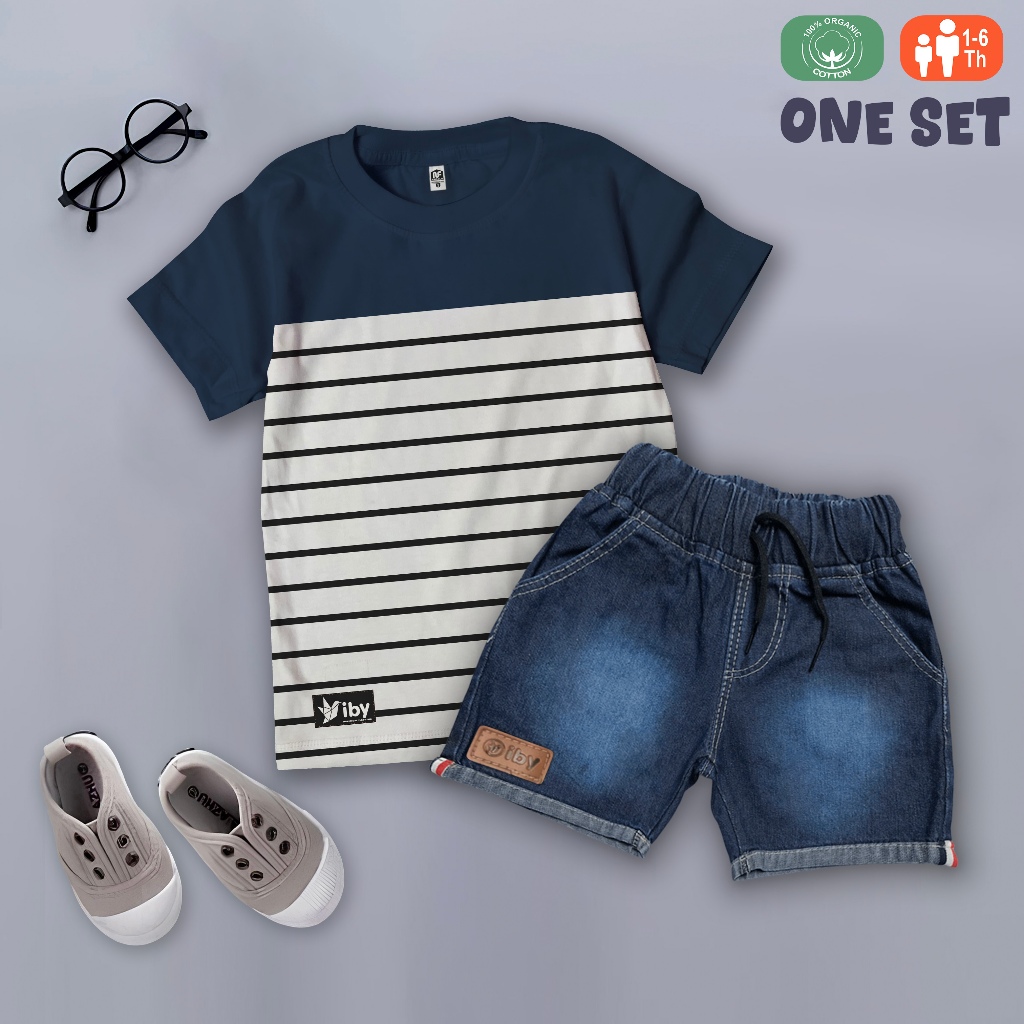 Almont Garis Kaos Anak Laki-Laki & Celana Jeans Pendek – Outfit Kasual