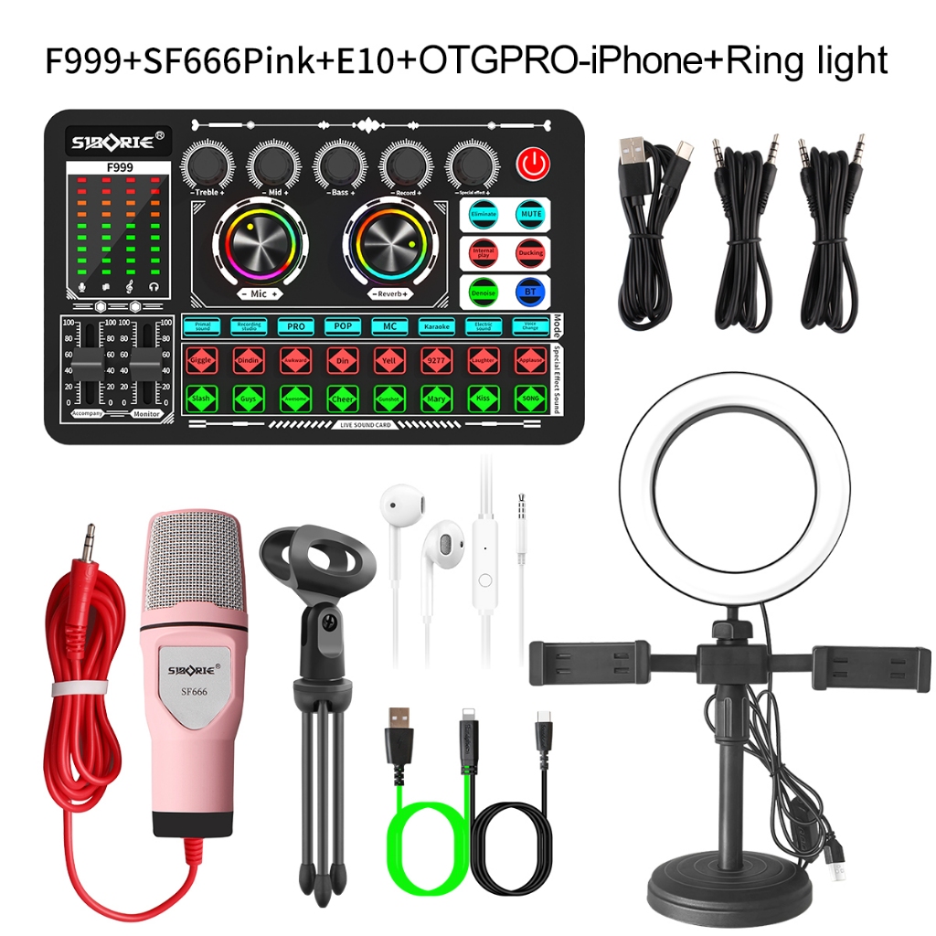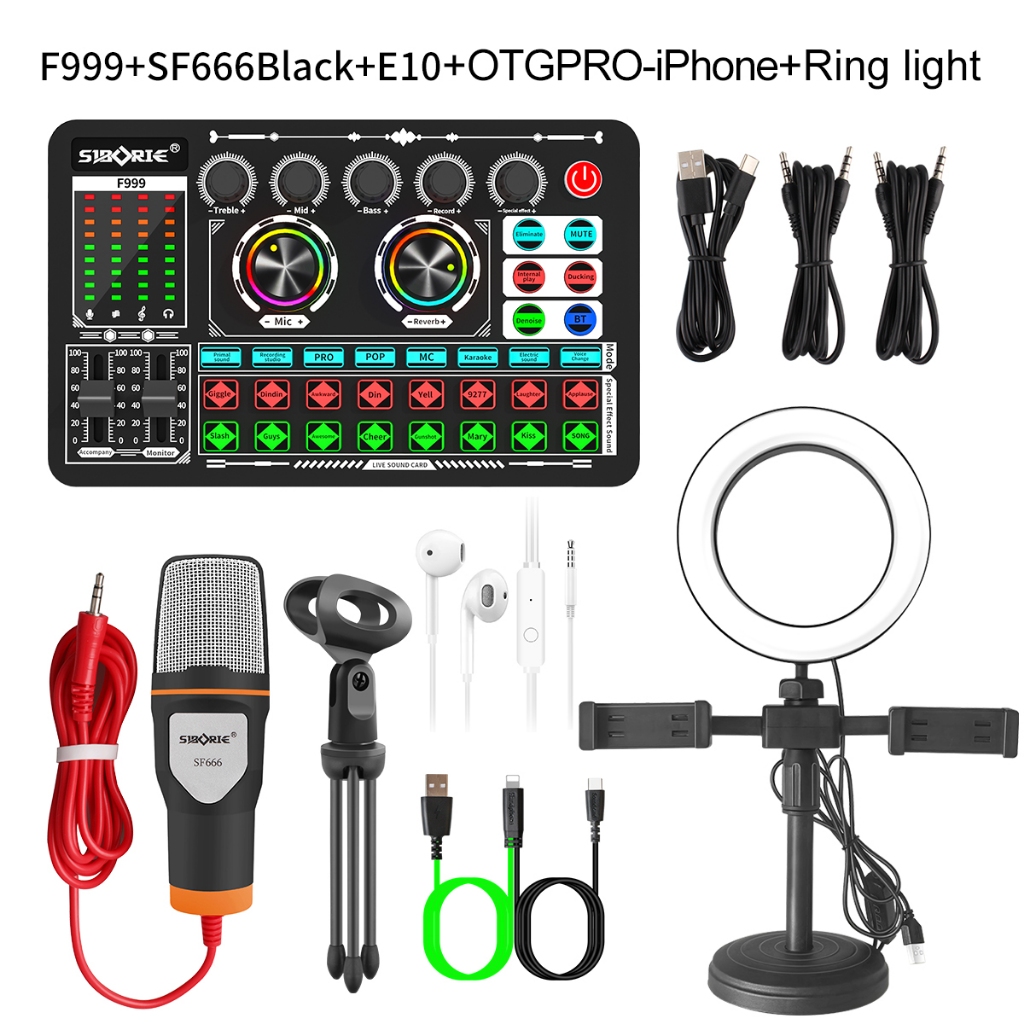 Onered soundcard F999+SF666+E10+OTGPRO-Type C/Lightning+Ring light paket lengkap set Mixer bluetooth for audio making Me