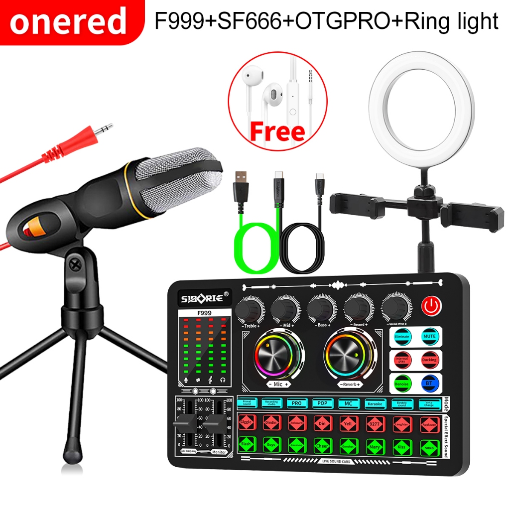 Onered soundcard F999+SF666+E10+OTGPRO-Type C/Lightning+Ring light paket lengkap set Mixer bluetooth for audio making Me