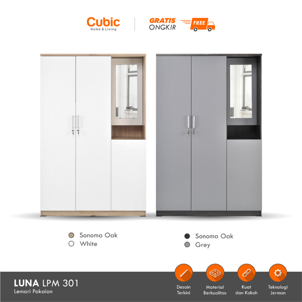 Cubic Lemari Pakaian Cermin Minimalis 3 Pintu / Lemari Baju - LUNA LPM 301
