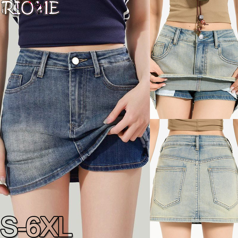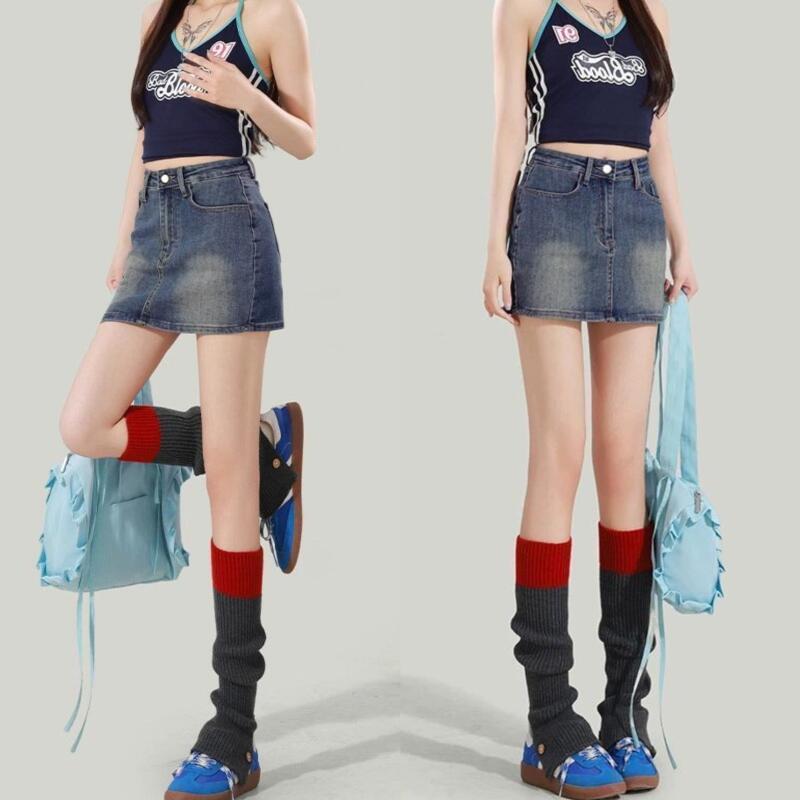 Rok Mini Denim Pinggang Tinggi Biru Retro Wanita Musim Panas