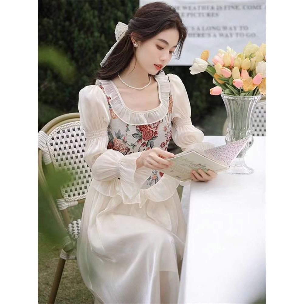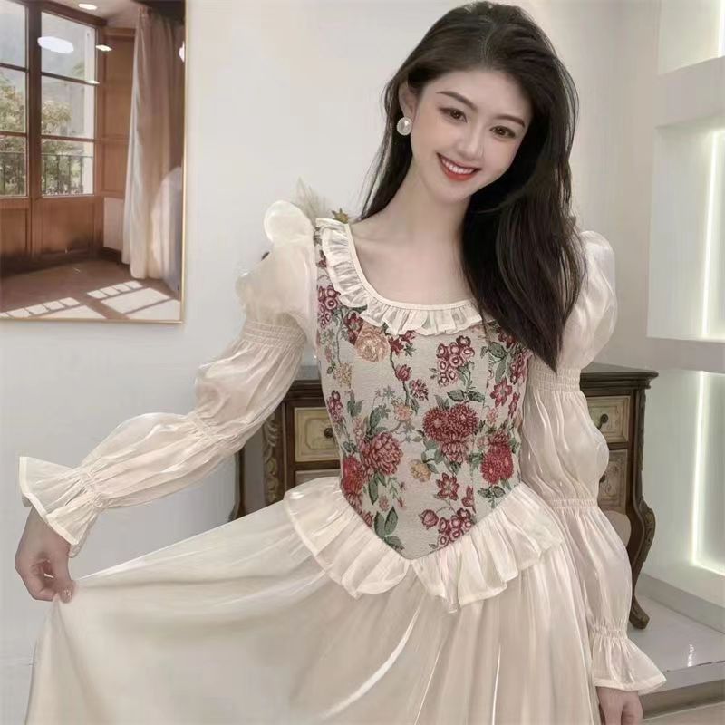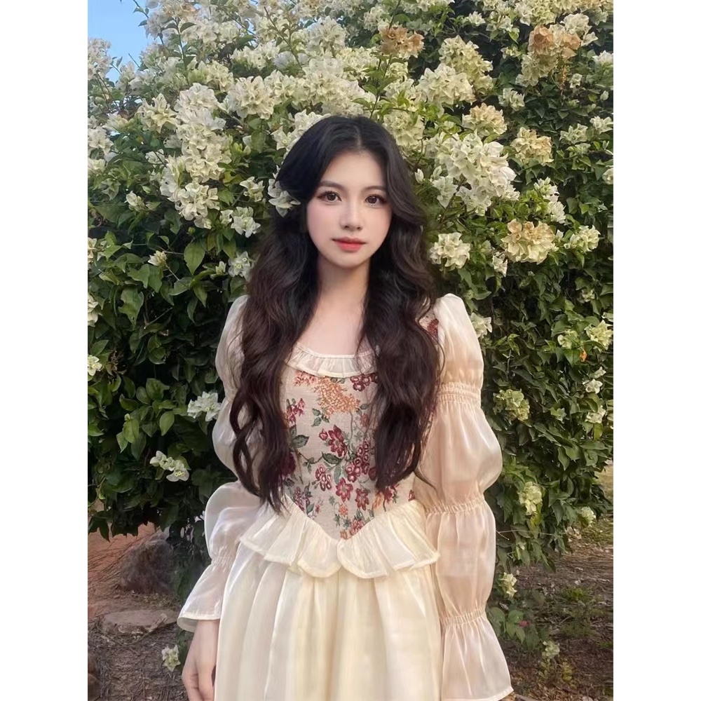 66TT Dress Darling HTXZ001 Gaun Lengan Panjang Putri Buronan Retro Perancis Untuk Wanita Gaun Peri Ramping Dan Lembut