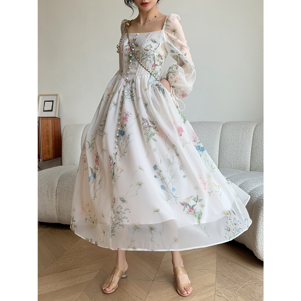Gaya baru Gaun Prancis Fishbone Skinny Dicetak Peri Cinta Pertama Gaun Peri Putri Gaun Panjang Gaun Panjang Bunga Perseg