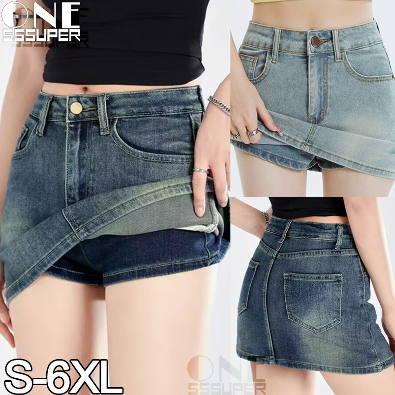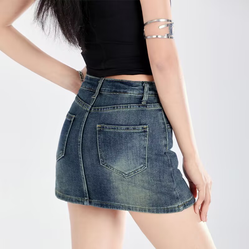 Rok A-line denim pinggang tinggi biru wanita rok pinggul pas badan bergaya Korea.