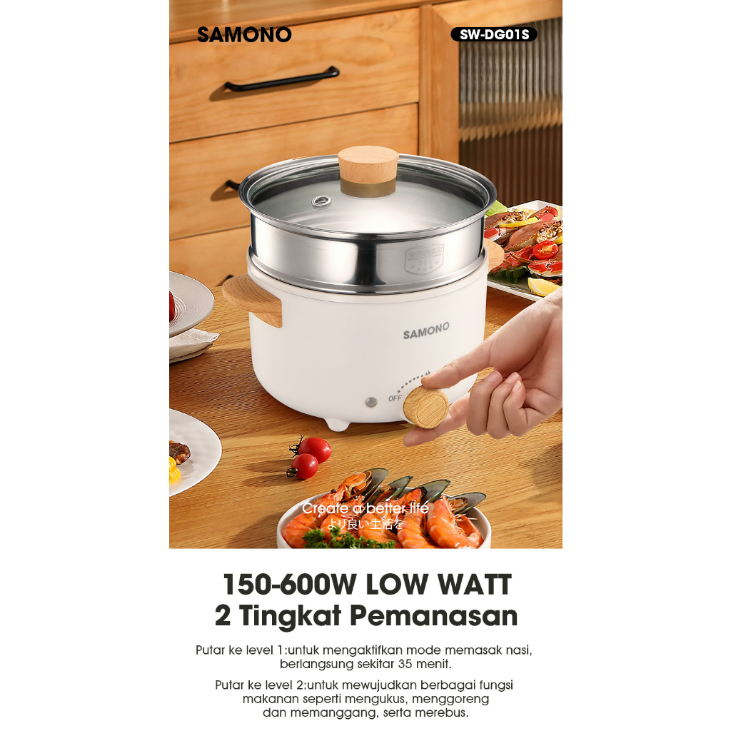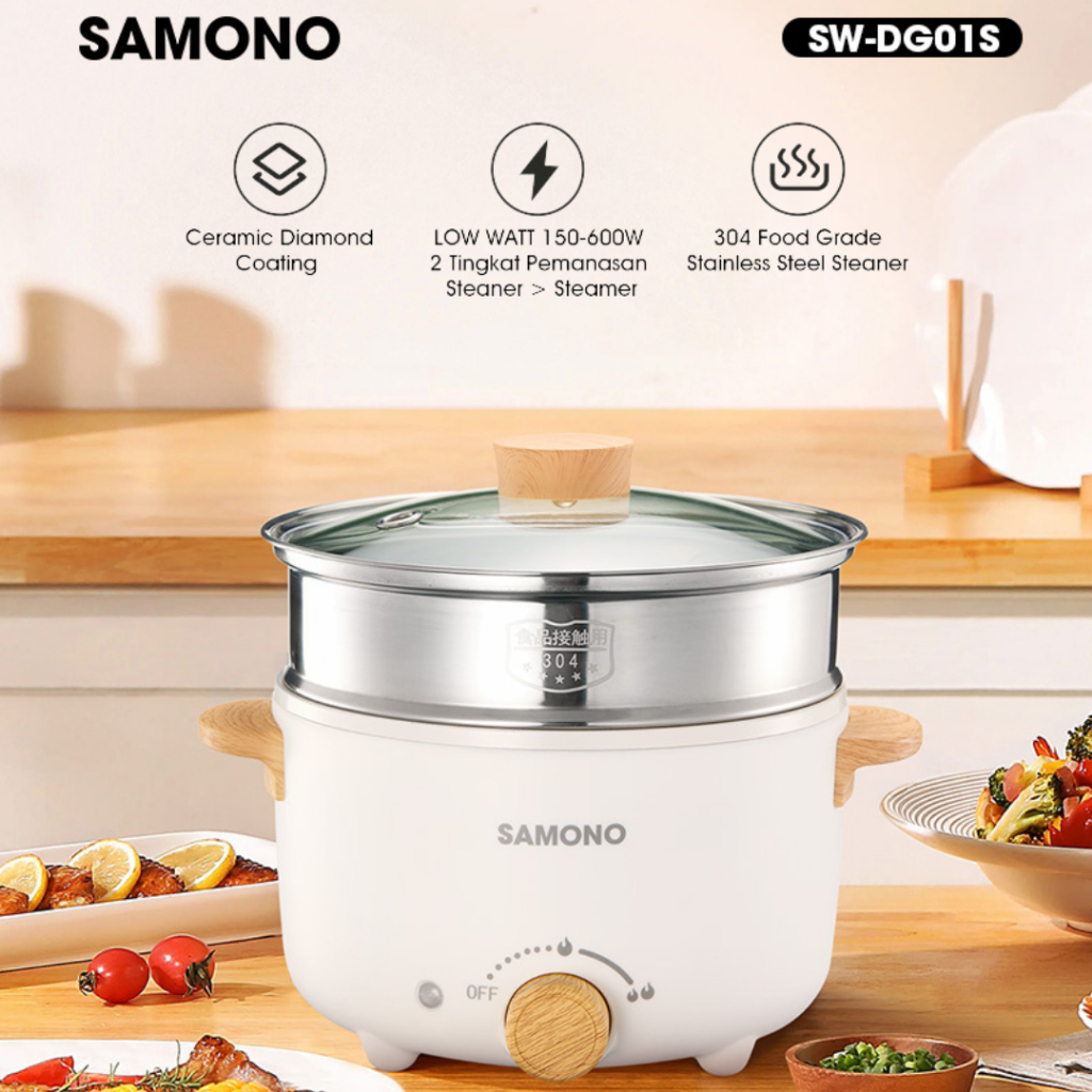SAMONO SW-DG01S Panci Kukusan Listrik 4 Liter Teflon Keramik Elektrik Cooking Pot Cooker Stainless Serbaguna Low Watt 1