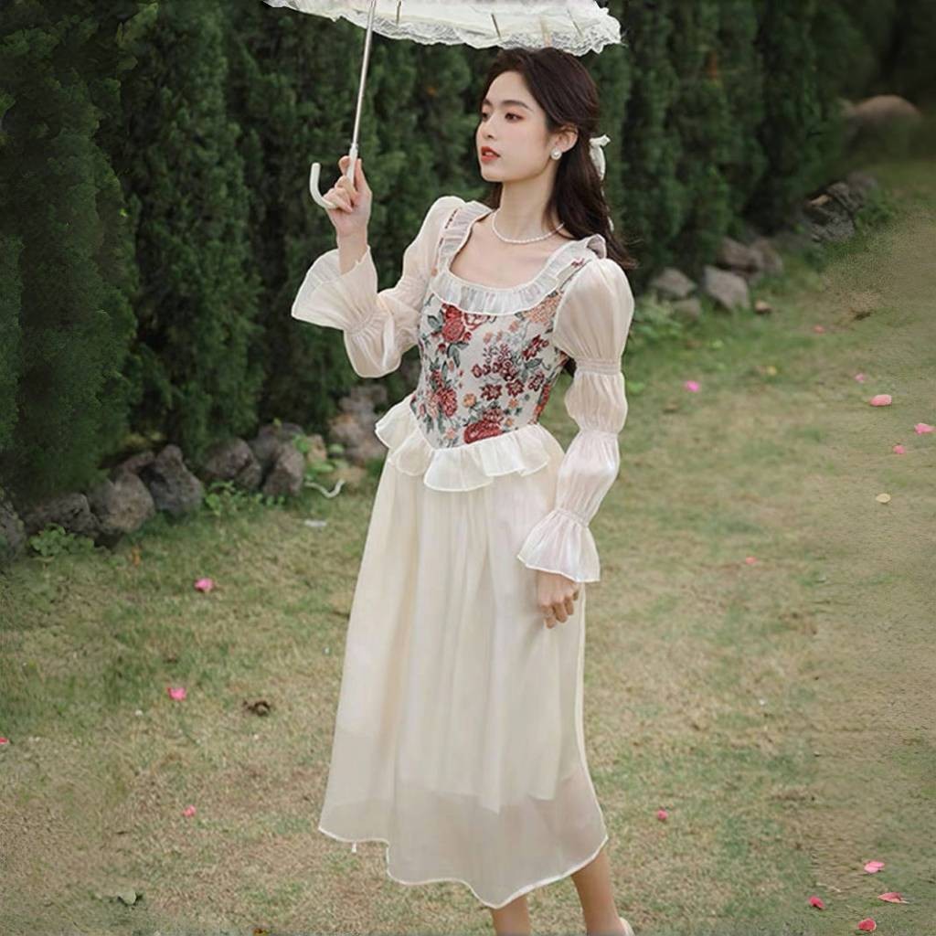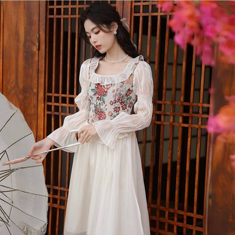 Gaun Pesta Retro Prancis [Leher Bulat Lengan Gelembung Panjang] Dress Gaya Pengadilan M562