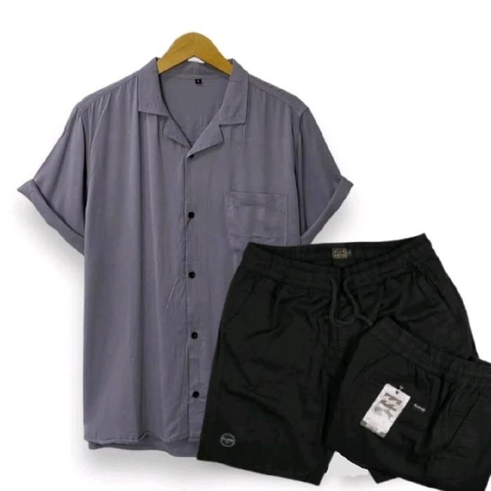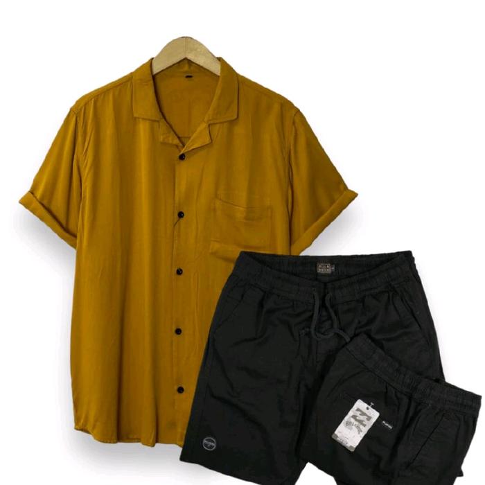 One Set Setelan Kemeja Polos Pendek Hawai Dan Celana Boardshort Hitam Premium Keren Atasan Pria Casual - Mustard X Bst H