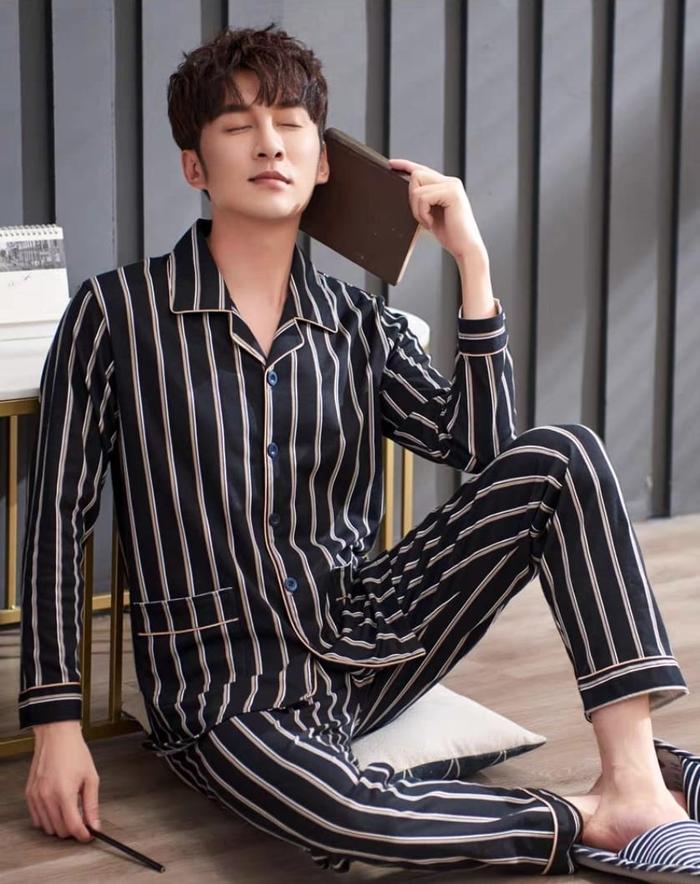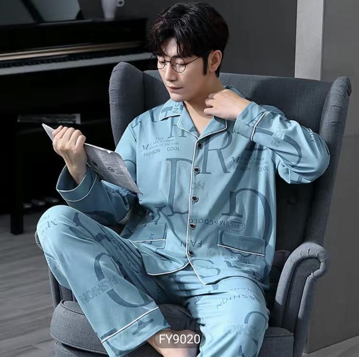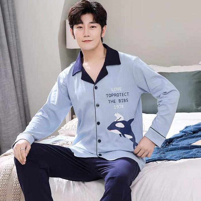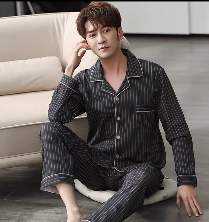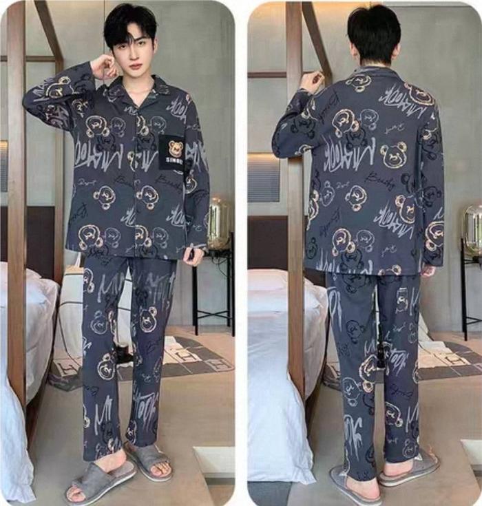 Baju Tidur Piyama Setelan Pp Cowok Pria Dewasa Bahan Kaos Katun Lengan Panjang Celana Panjang Model Kancing Lima Size L