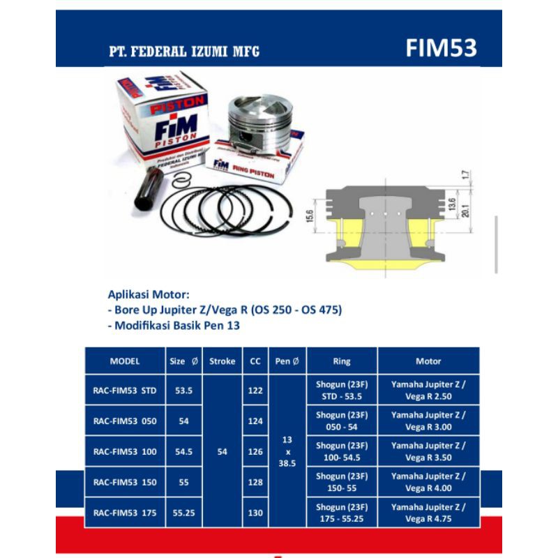 PISTON SEHER FIM53 JUPITER Z VEGA R UK 53.5 54 54.5 55 PIN PEN 13 BORE UP