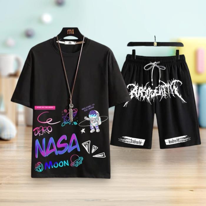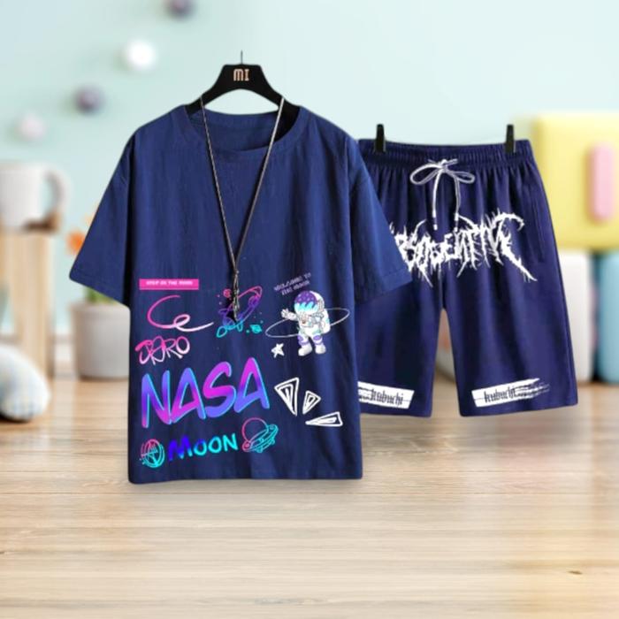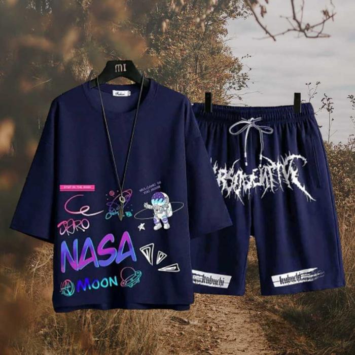 1 Set Style Outfit Cowok Set Baju Nasamoon Kaos Dan Celana Pendek Pria Motif Panjang Dewasa Casual - Navy, L
