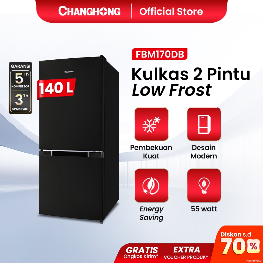Changhong Kulkas 2 Pintu (Bottom Mounted Refrigerator) Lemari Es Kapasitas 140 Liter FBM170DB Black (Semi Auto Defros