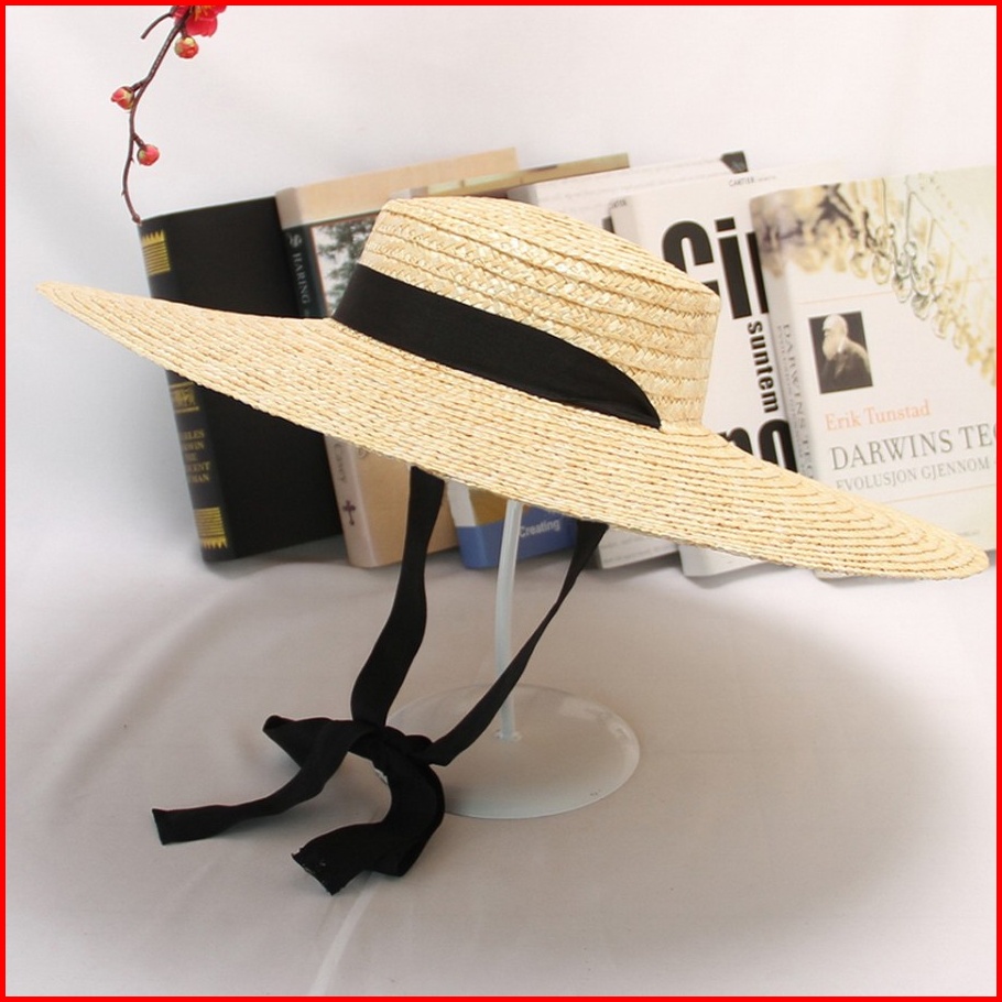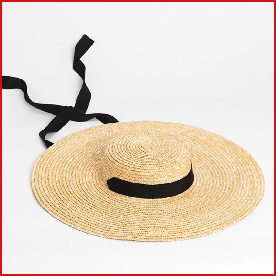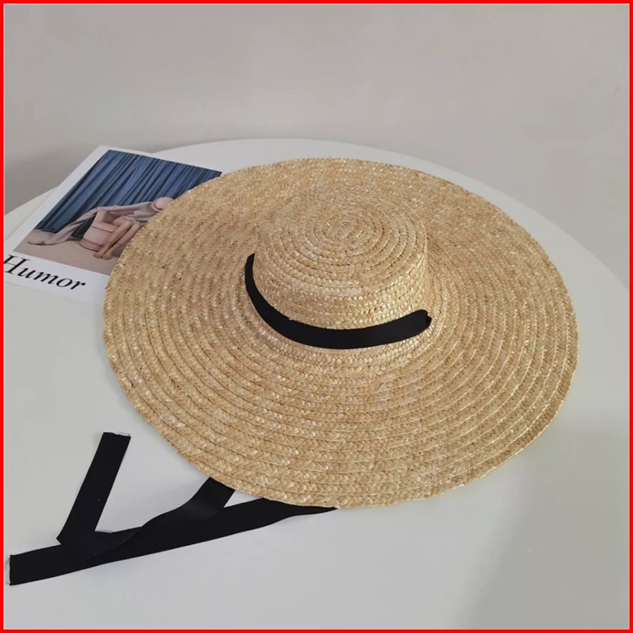 Topi Pantai Import Lebar Premium Pita Leher Anyaman Jerami Murni