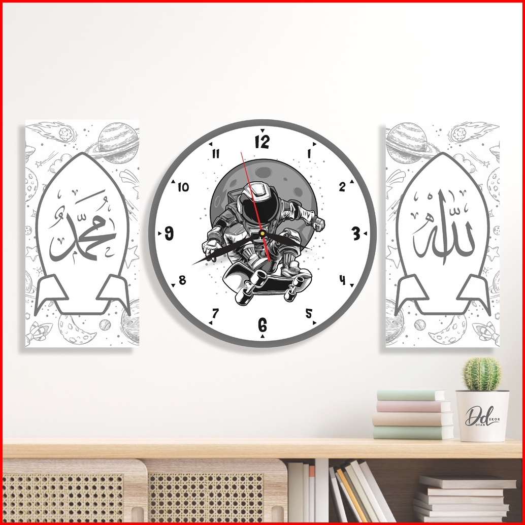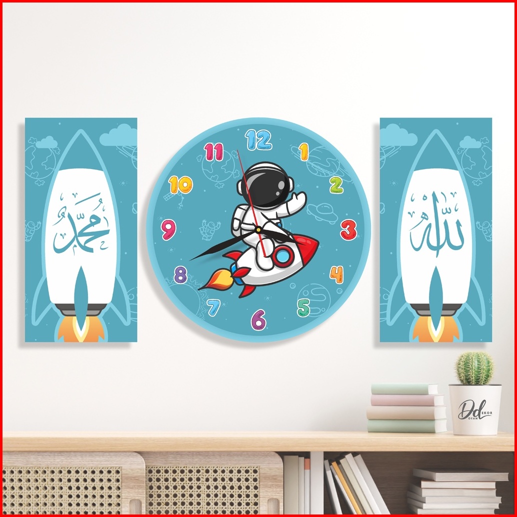 Jam Dinding Kaligrafi Kartun Astronout Full Set Allah Muhammad Hiasan Kamar Tidur Anak Karakter Lucu
