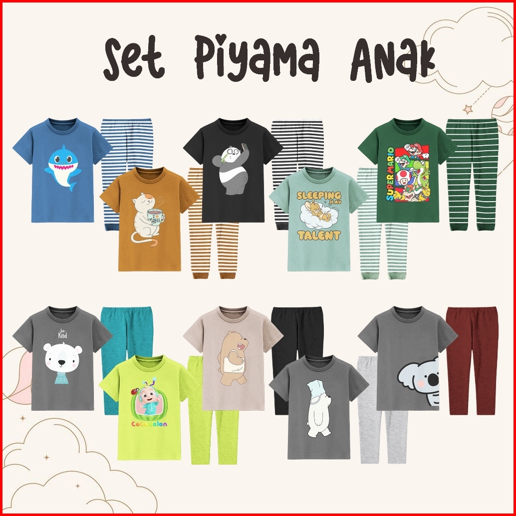 Kaos Piyama Set Anak Laki-laki Perempuan 1-10 Tahun Motif Hewan