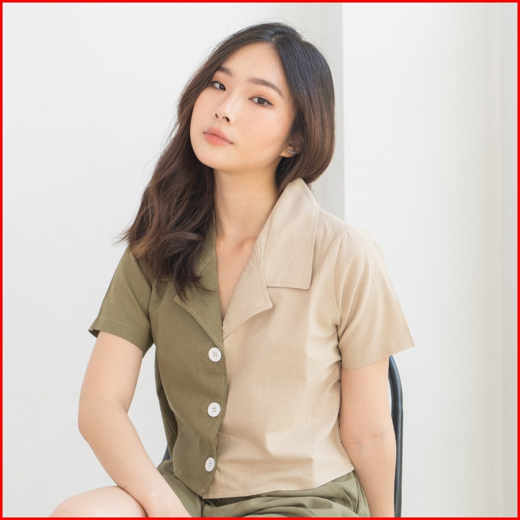 Dalmi Aelin Shirt Atasan Kemeja Blouse Korean Wanita Linen Basic Two Tone Premium Outer Shirt