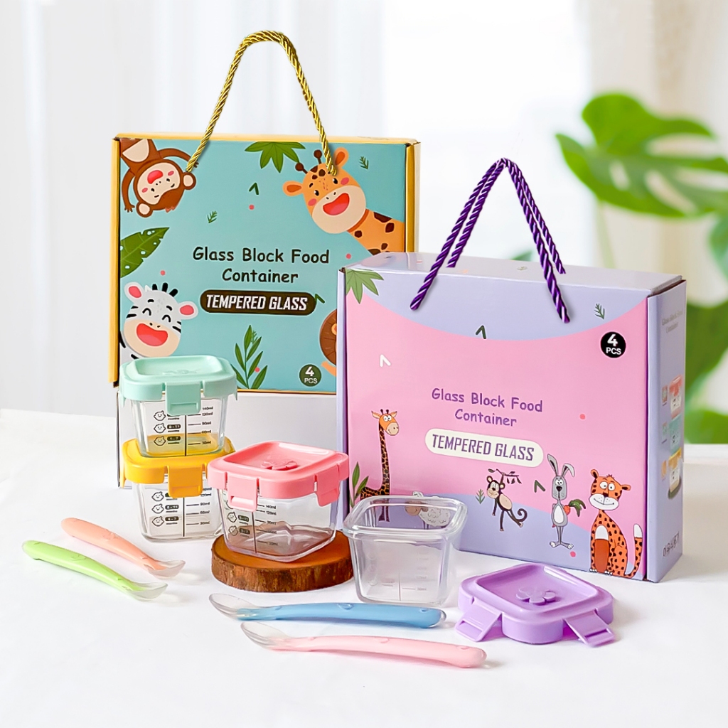 Ideame Wadah Penyimpanan Kotak Mpasi Kaca 4in1 & 6in1 / Food Container Kedap Udara + Sendok Mpasi Silicon Bayi / Peralat