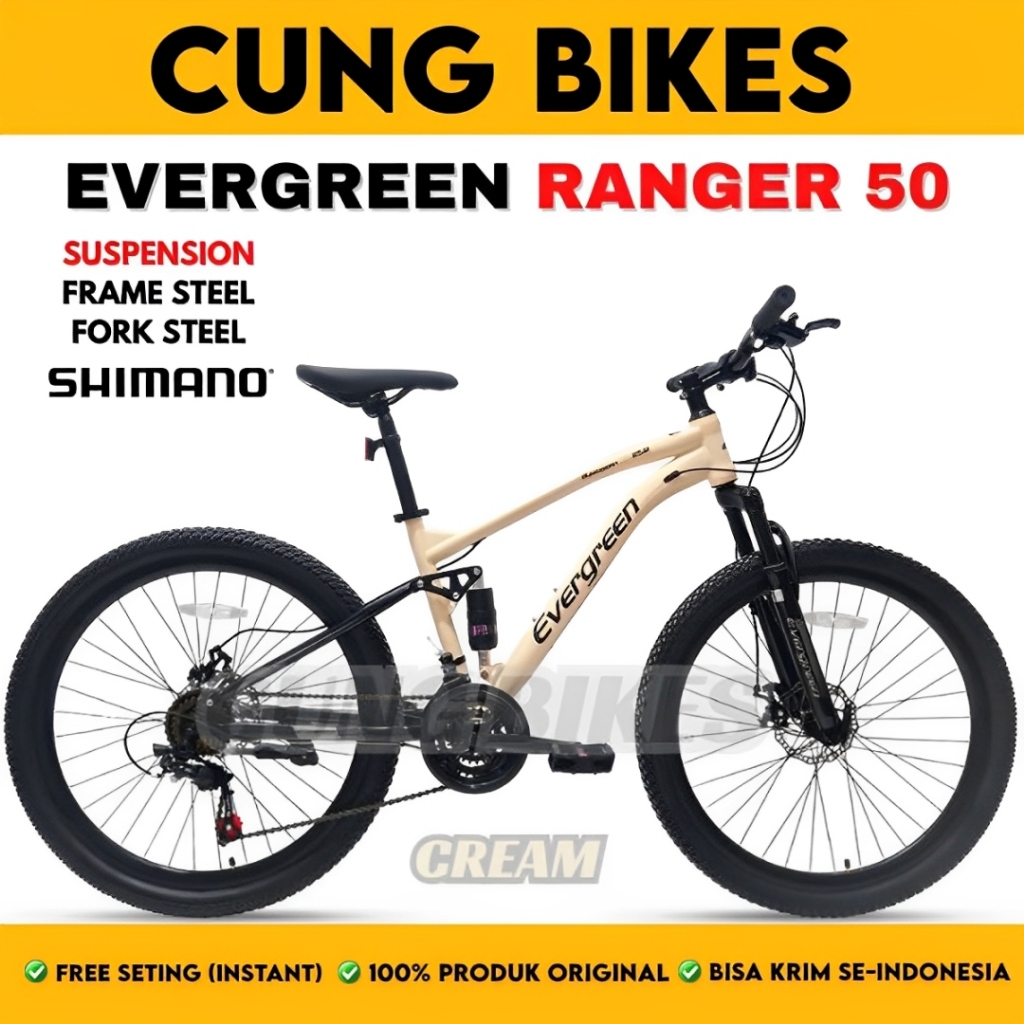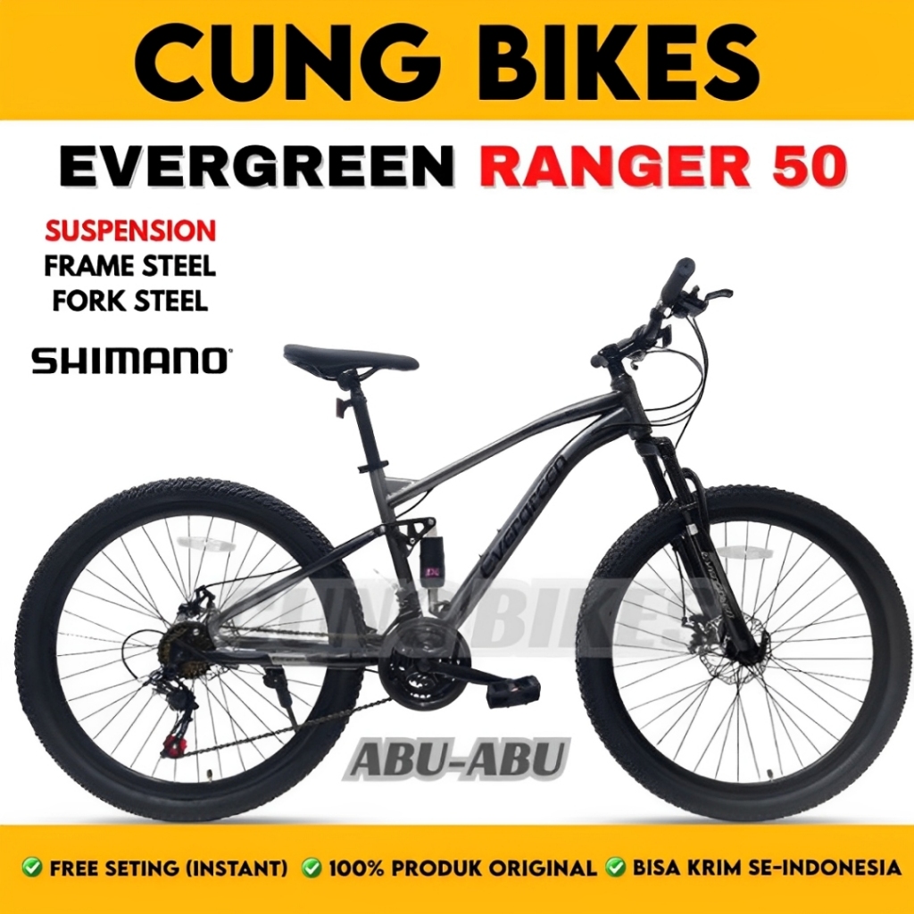 Sepeda Gunung MTB Evergreen Ranger R50 Full Suspension ukuran 26 Inch 3x7 speed Shimano
