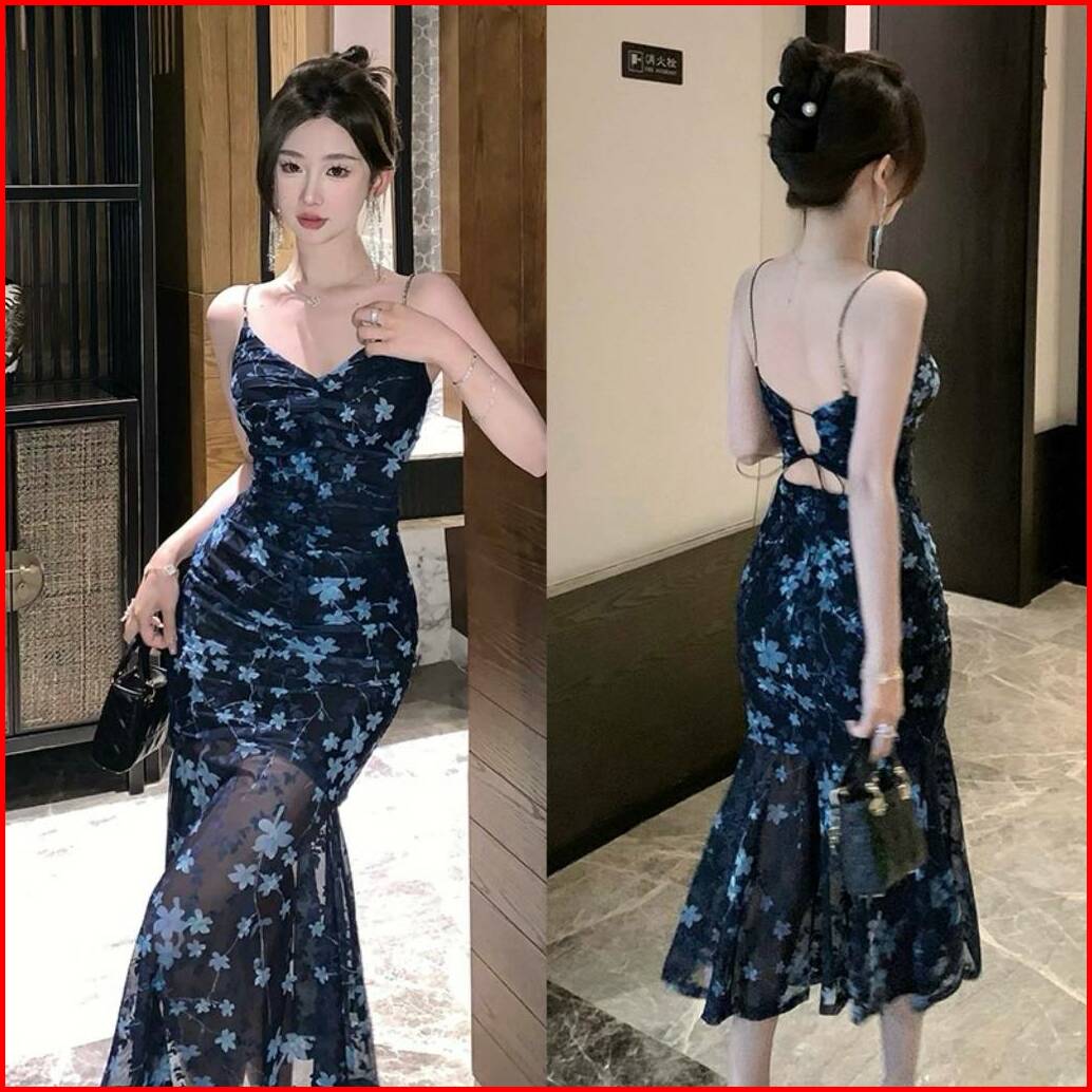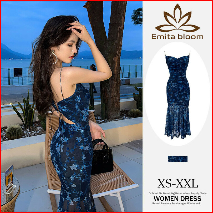Emita Bloom Blue Midi Floral Dress Baju Pantai Wanita Dress Biru Korean Style Party Elegan Xs-2xl