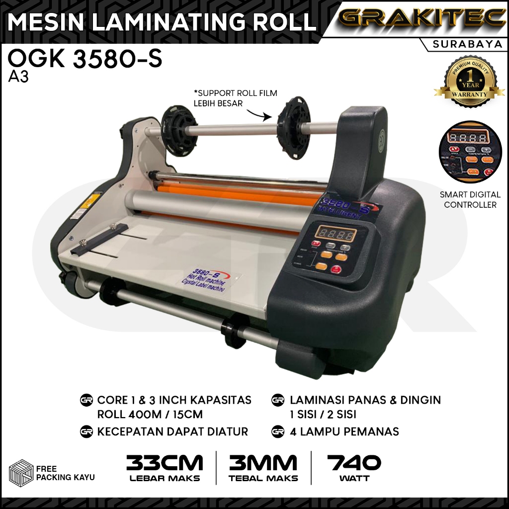 Mesin Laminasi / Laminating Roll A3+ OGK 3580s Hot ( Panas ) + Cold ( Dingin ) 4 Lampu Pemanas