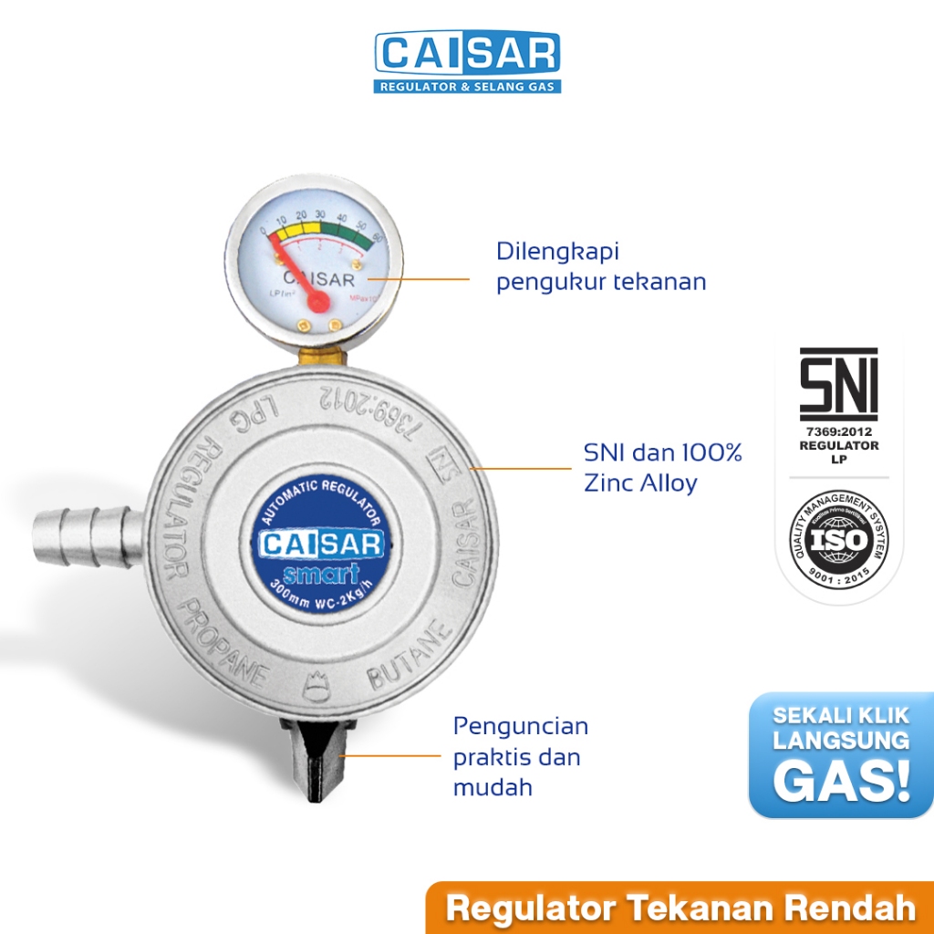 CAISAR - Regulator Kompor Meter Smart Pengukur Tekanan Premium ANTI BOCOR SNI | Aman & Mudah Irit Pasang Elpiji LPG Tekanan Rendah (RMS) Wing, Quantum, Destec, Starcam, Nise