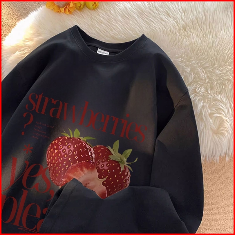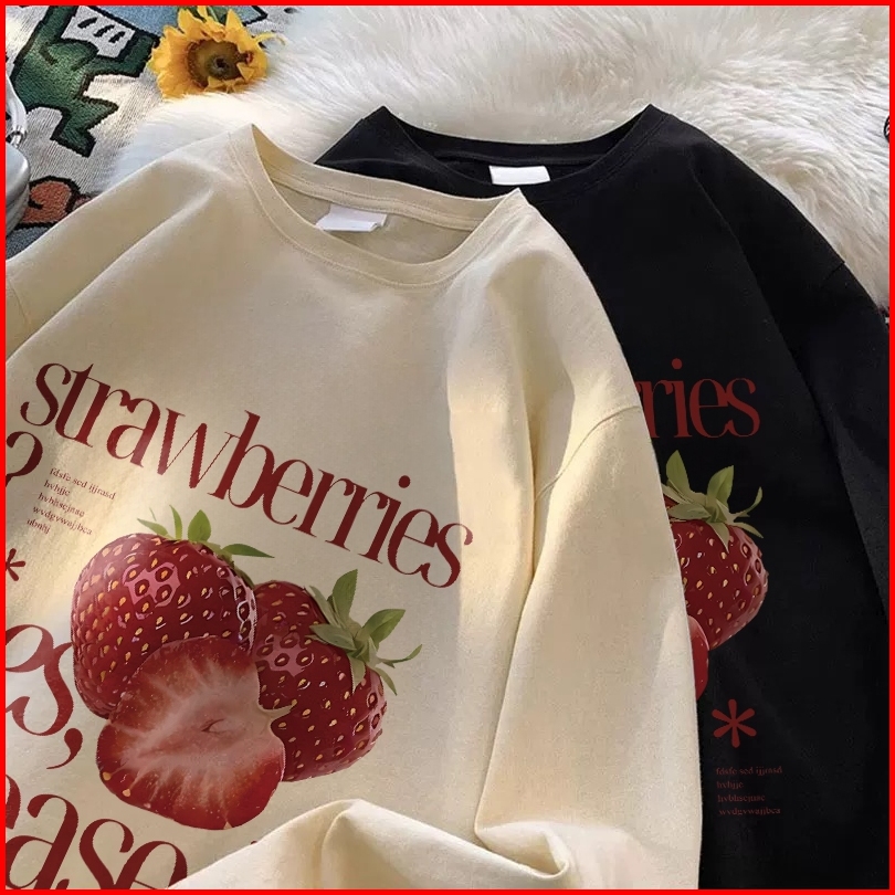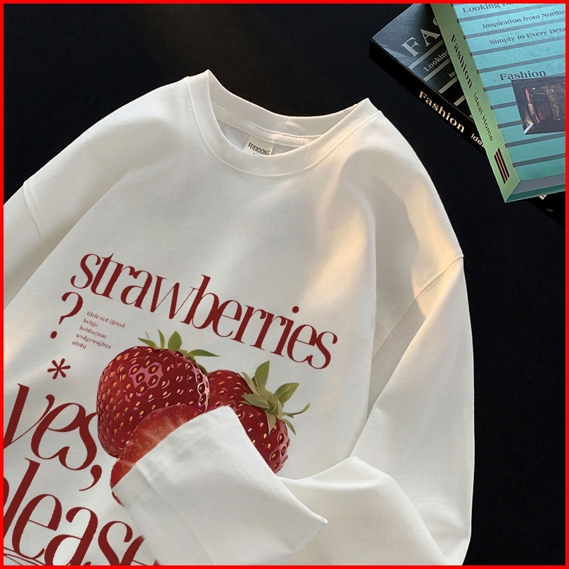 Forteid Atasan Kaos Wanita Oversize Lengan Panjang Korean Style Cetakan Strawberry Letter Print Baju Kaos Polos Cotton C
