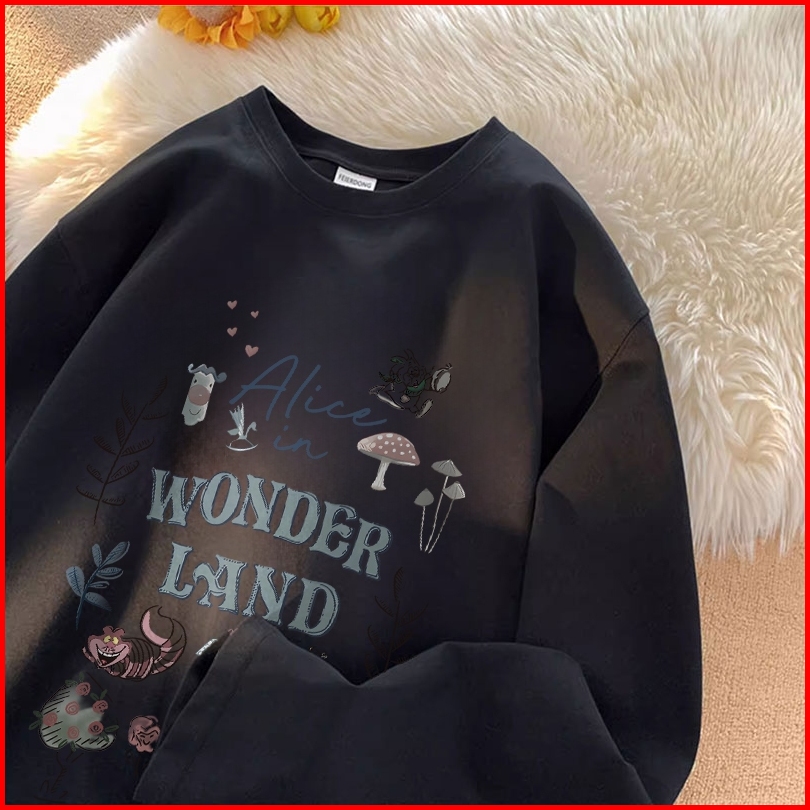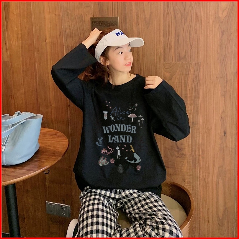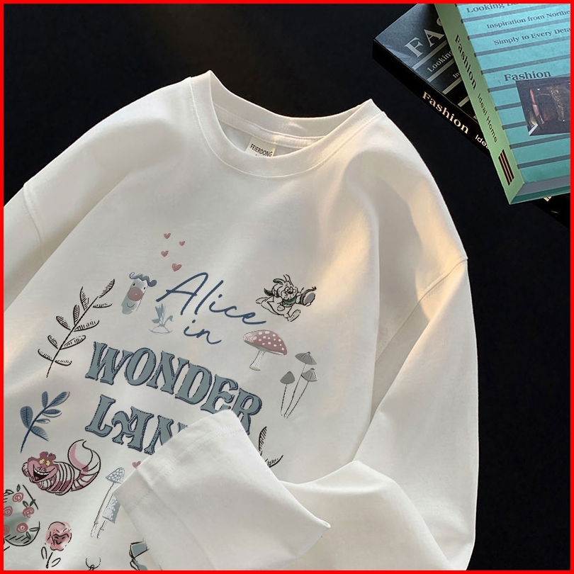 Forteid Atasan Kaos Wanita Oversize Lengan Panjang Korean Style Alice In Wonderland Lucy Baju Kaos Polos Cotton Combed P