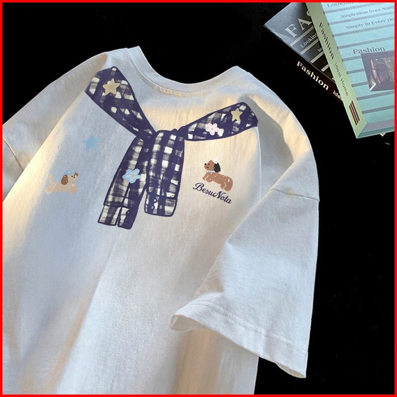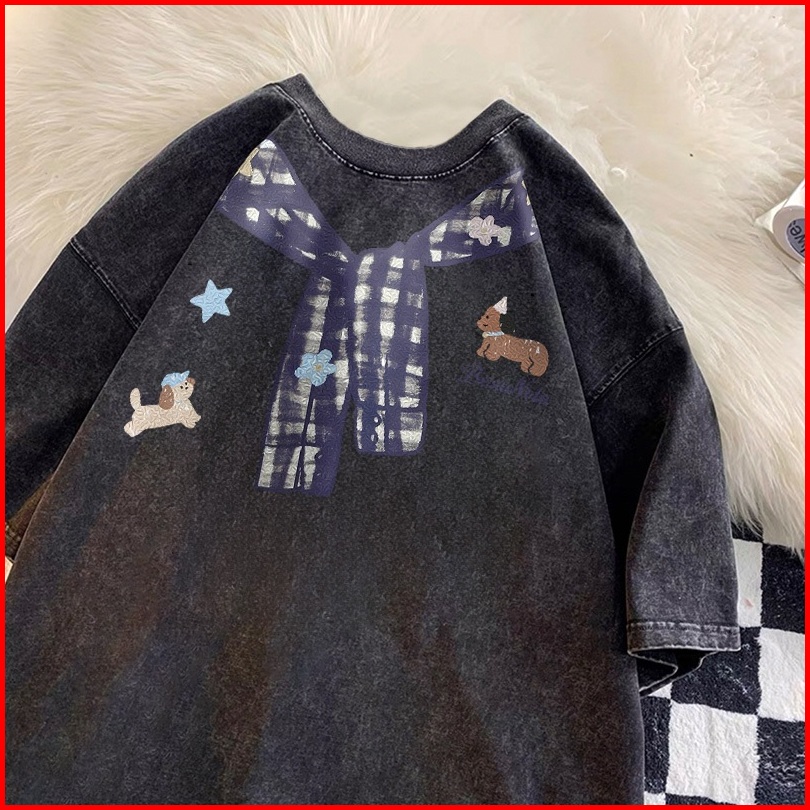 Forteid T-shirt Washed Oversize Cetakan Pola Dasi Kupu-kupu Baju Atasan Lengan Pendek Wanita Kaos Oversize Terbaru Kaos