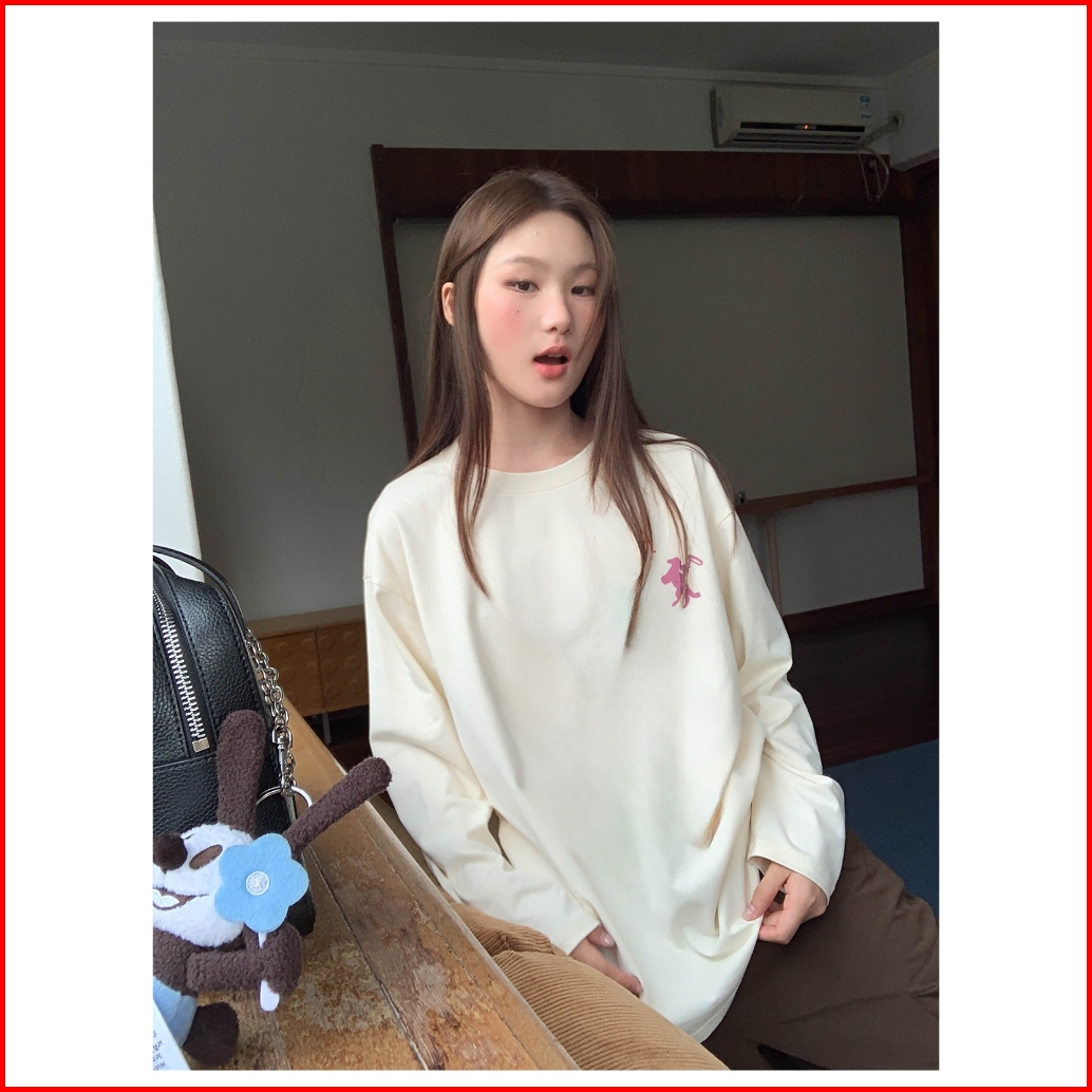 Forteid Atasan Kaos Wanita Oversize Lengan Panjang Korean Style Cetak Pola Kuda Berkuda Koboi Merah Muda Baju Club Baju