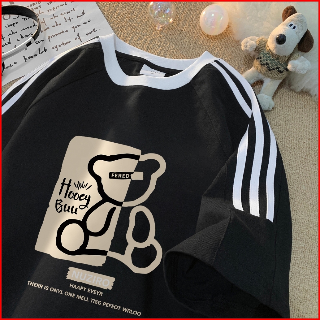 Forteid Cetakan Merek Trendi Retro Baju Oversize Bergaris Bahu Korean Style Kaos Longgar Beruang Garis
