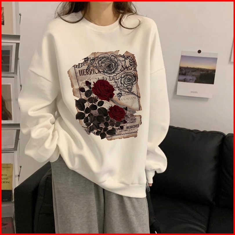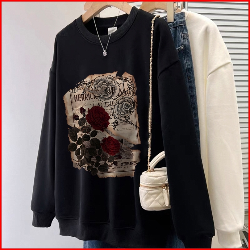 Forteid Sweater Lengan Panjang Oversize Street Style Korean Style Switer Wanita Oversize Cetakan Koran Mawar Antik Korea