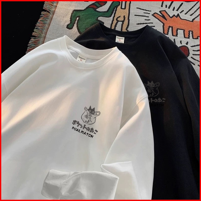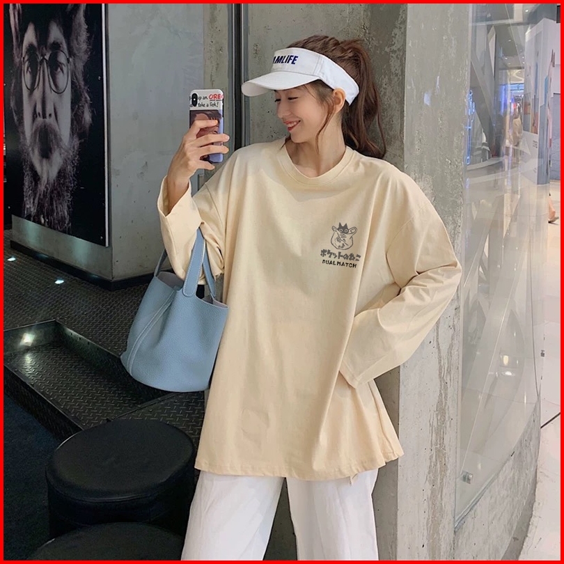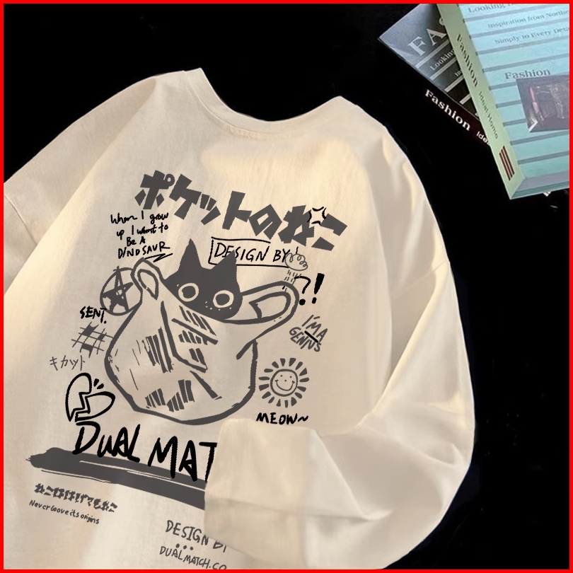 Forteid Atasan Kaos Wanita Oversize Lengan Panjang Korean Style Kucing Lucu Jepang Dengan Tali Baju Kaos Polos Cotton Co