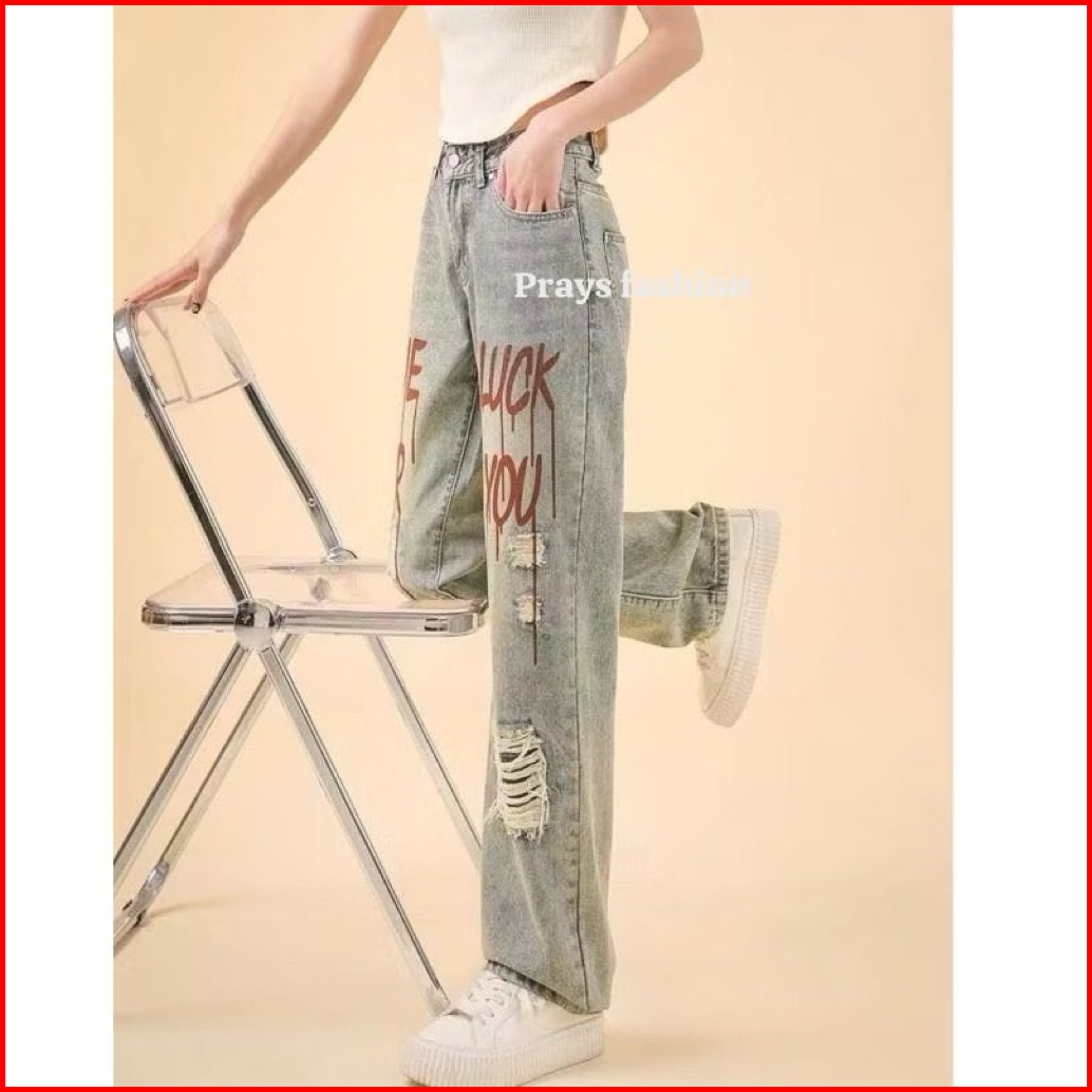 Celana Jeans Pinggang Tinggi Spice Girls Celana Jeans Sobek Motif Huruf Vintage Celana Denim Casual Longgar Snow