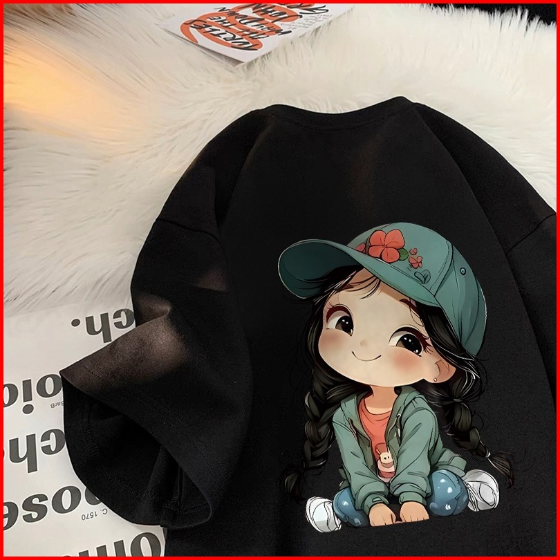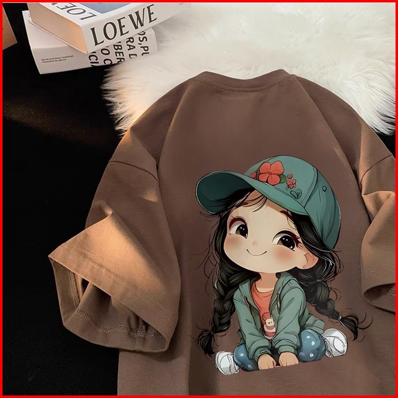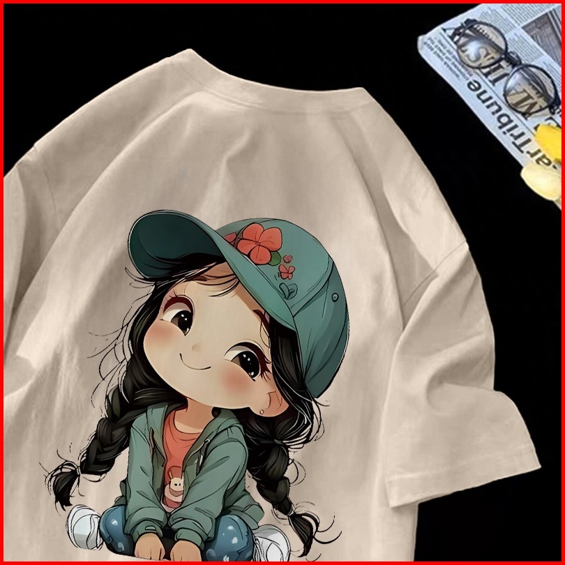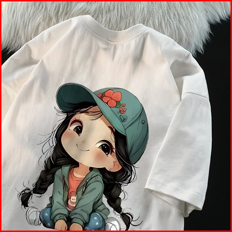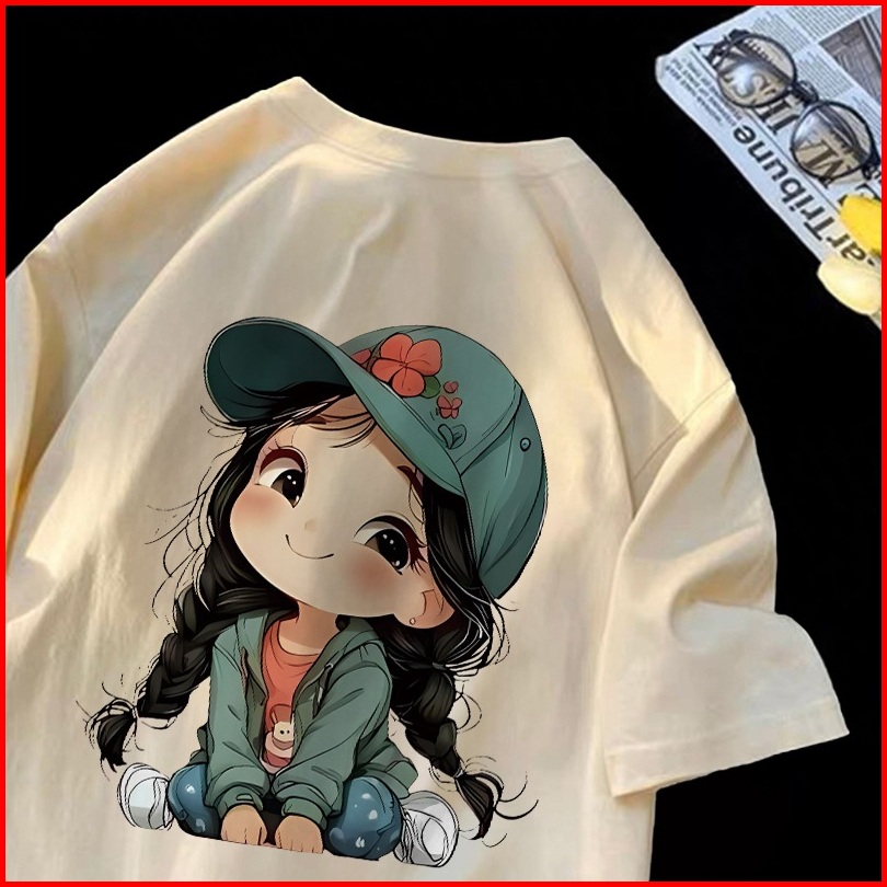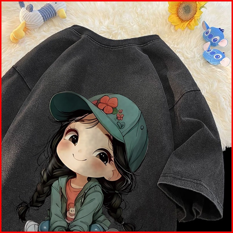 Forteid T-shirt Washed Oversize Cetakan Pola Gadis Kecil Yang Lucu Baju Atasan Lengan Pendek Wanita Kaos Oversize Terbar