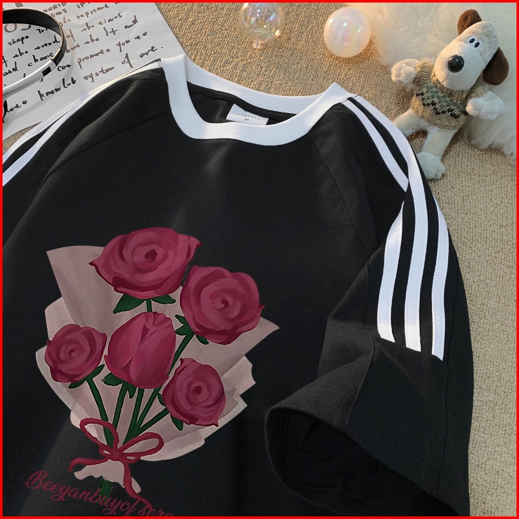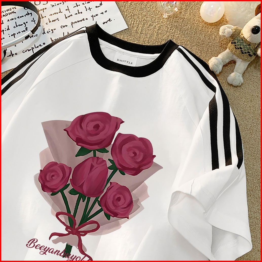 Forteid Cetakan Merek Trendi Retro Baju Oversize Cetak Pola Buket Korean Style Kaos Longgar Kaos Merah Putih Agustusan K