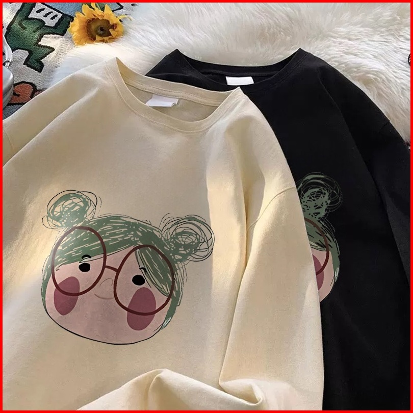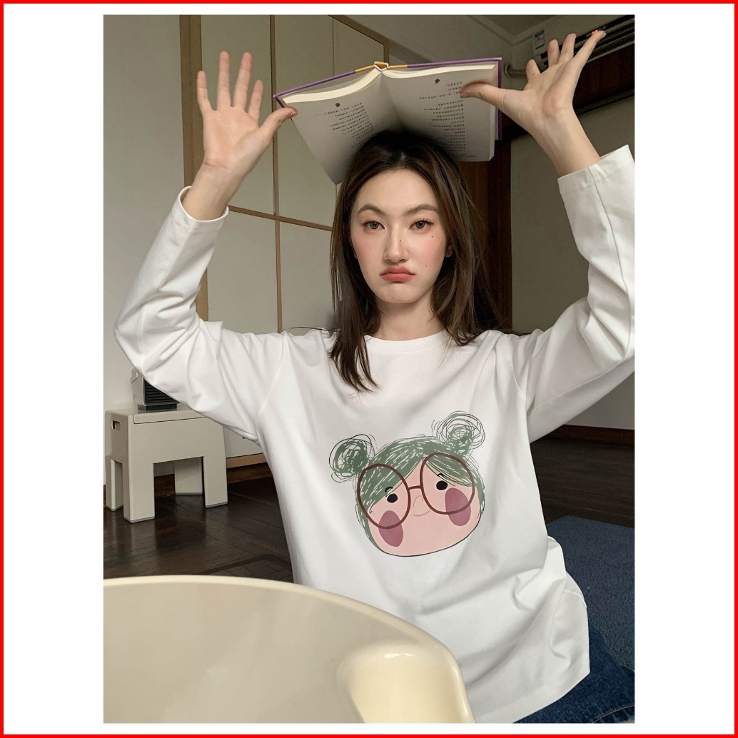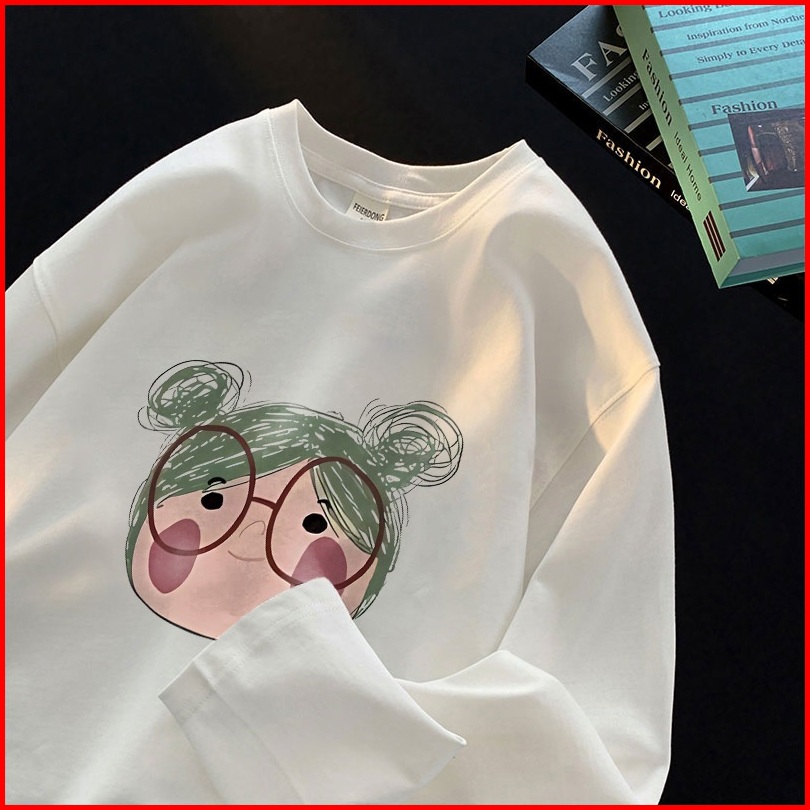 Forteid Atasan Kaos Wanita Oversize Lengan Panjang Korean Style Cetak Pola Kartun Gadis Lucu Baju Kaos Polos Cotton Comb